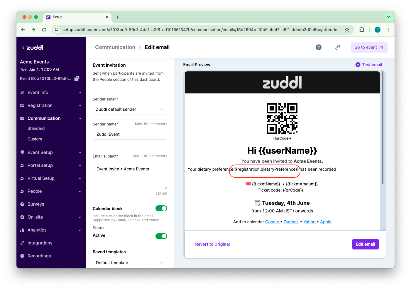 To use the custom fields that you've added in the registration form as merge tags, contact our support team at support@zuddl.com, they will provide the merge tag label which you can use while editing the emails. For example, to include a dietary preference custom field in your email, you can edit your email as shown below: