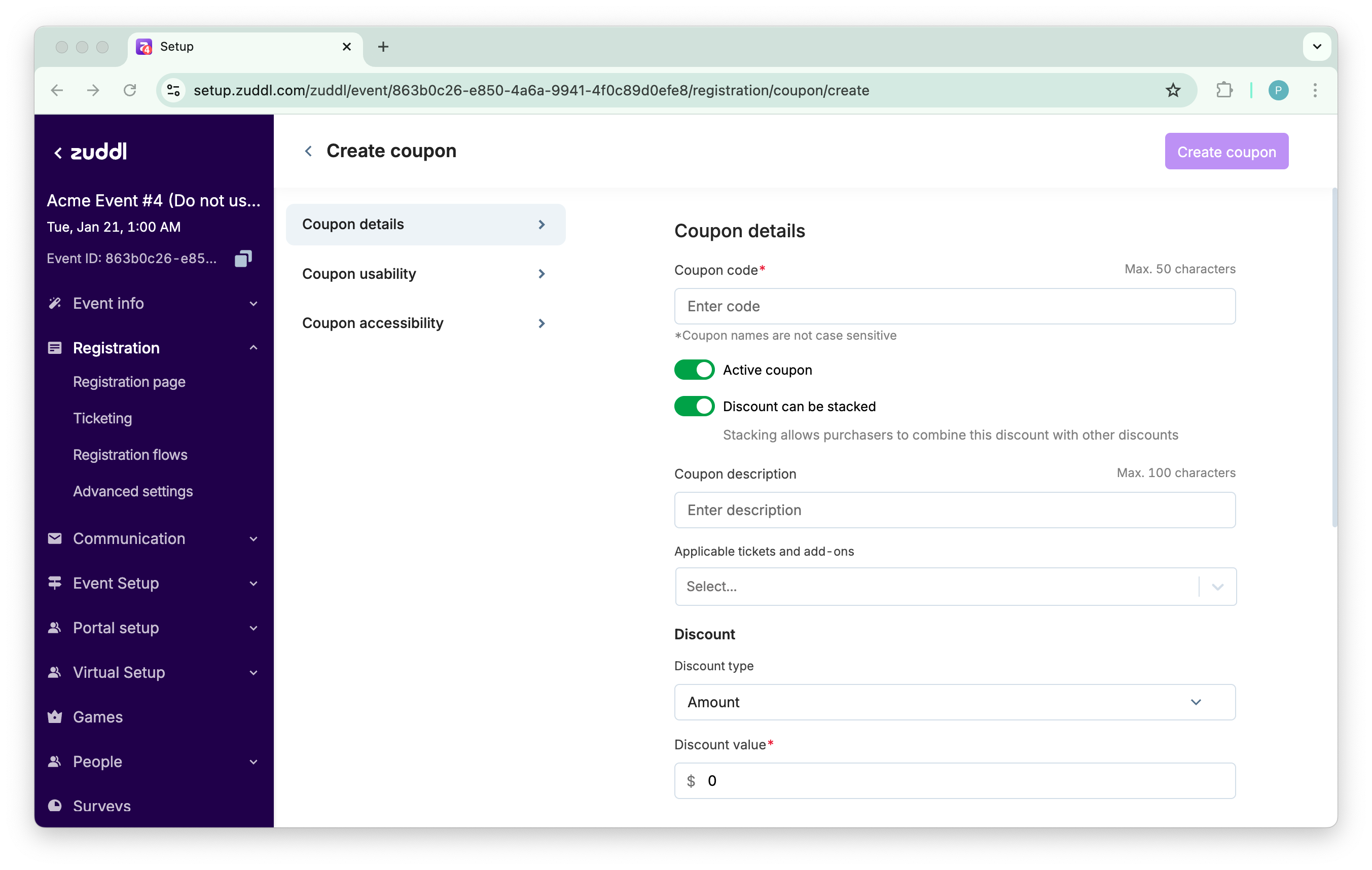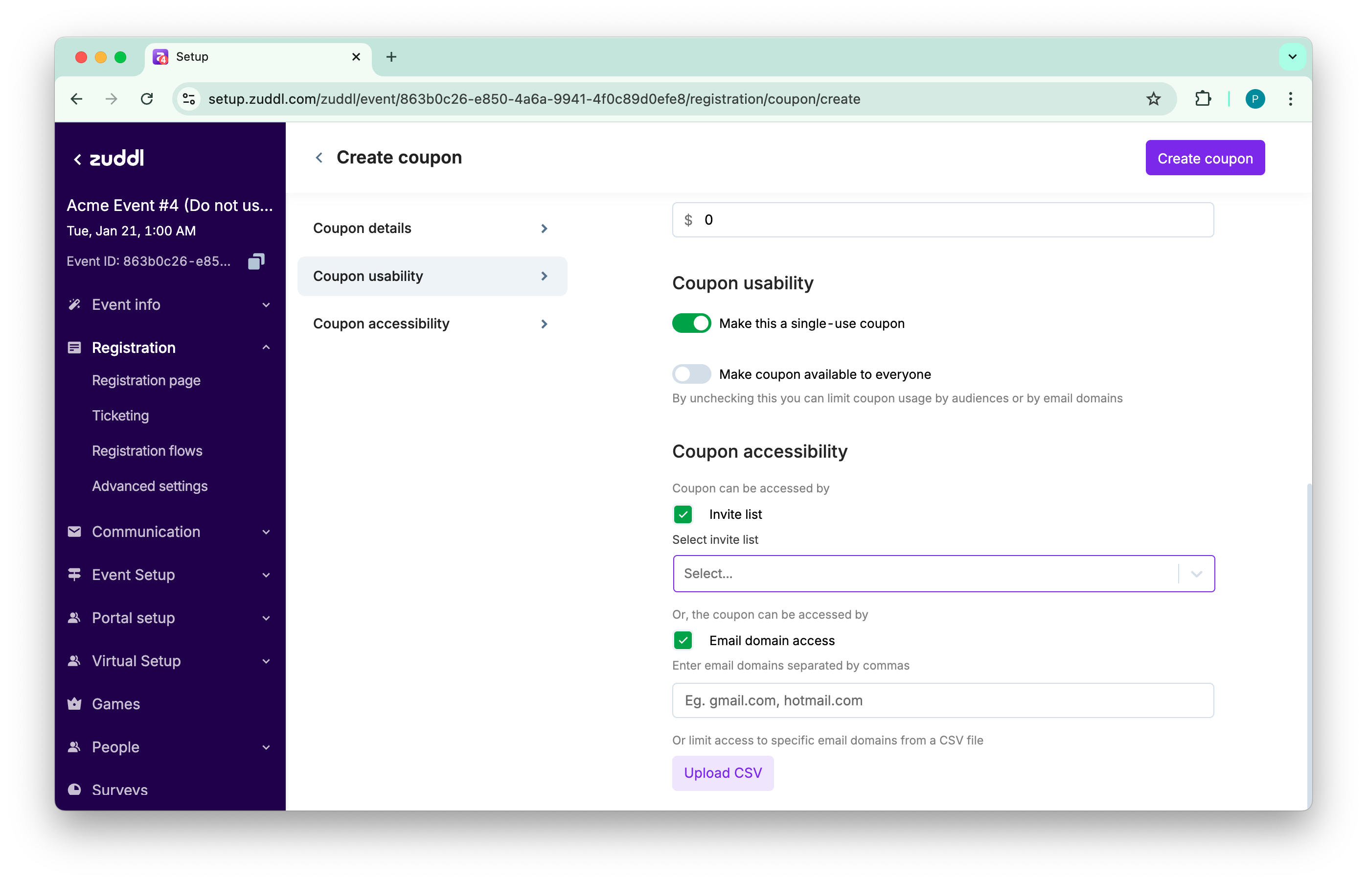 Zuddl lets you create coupons for tickets you create on Zuddl. Coupons can be applied at the time of checkout to redeem a discount on the ticket amount.
