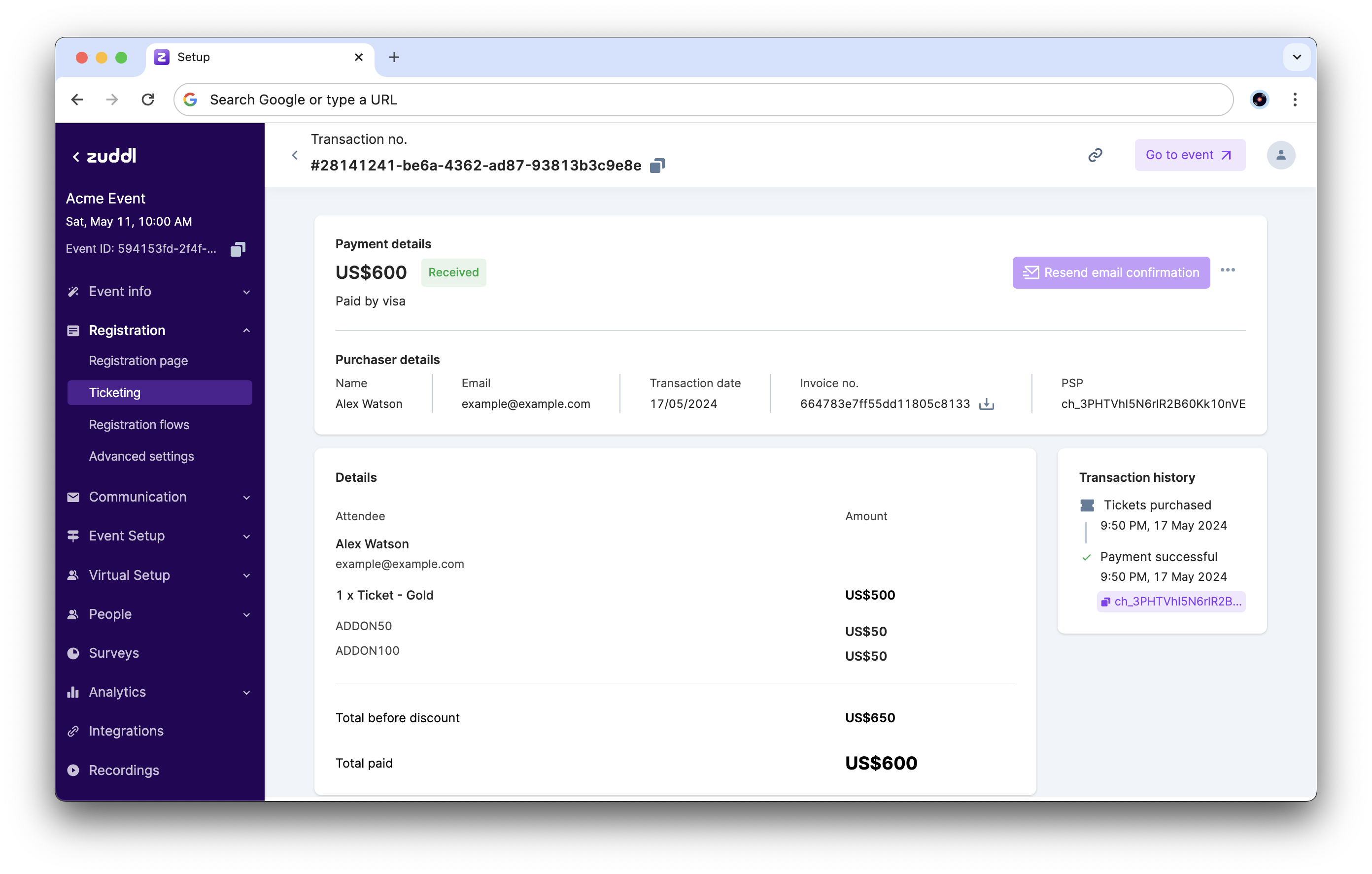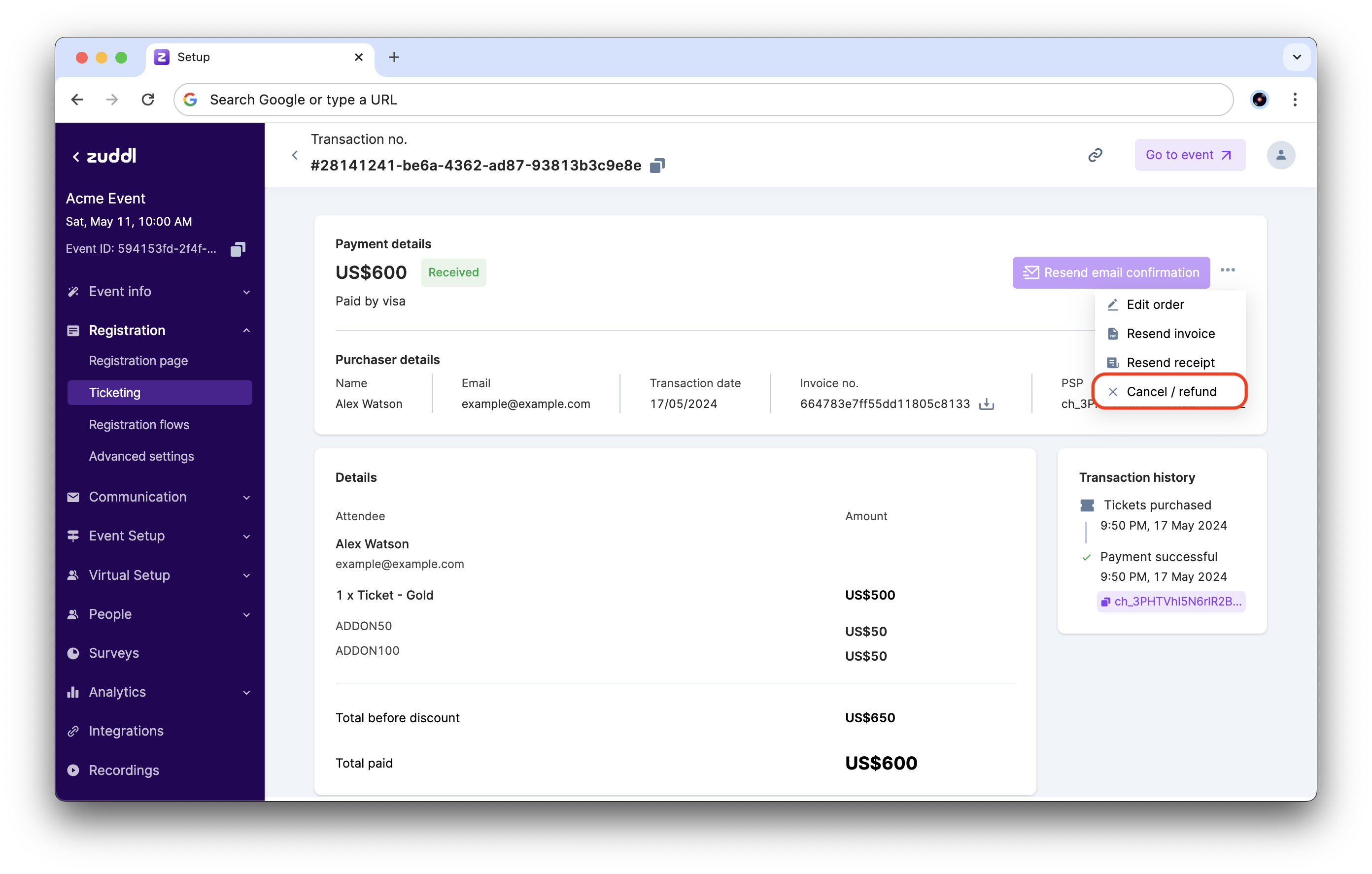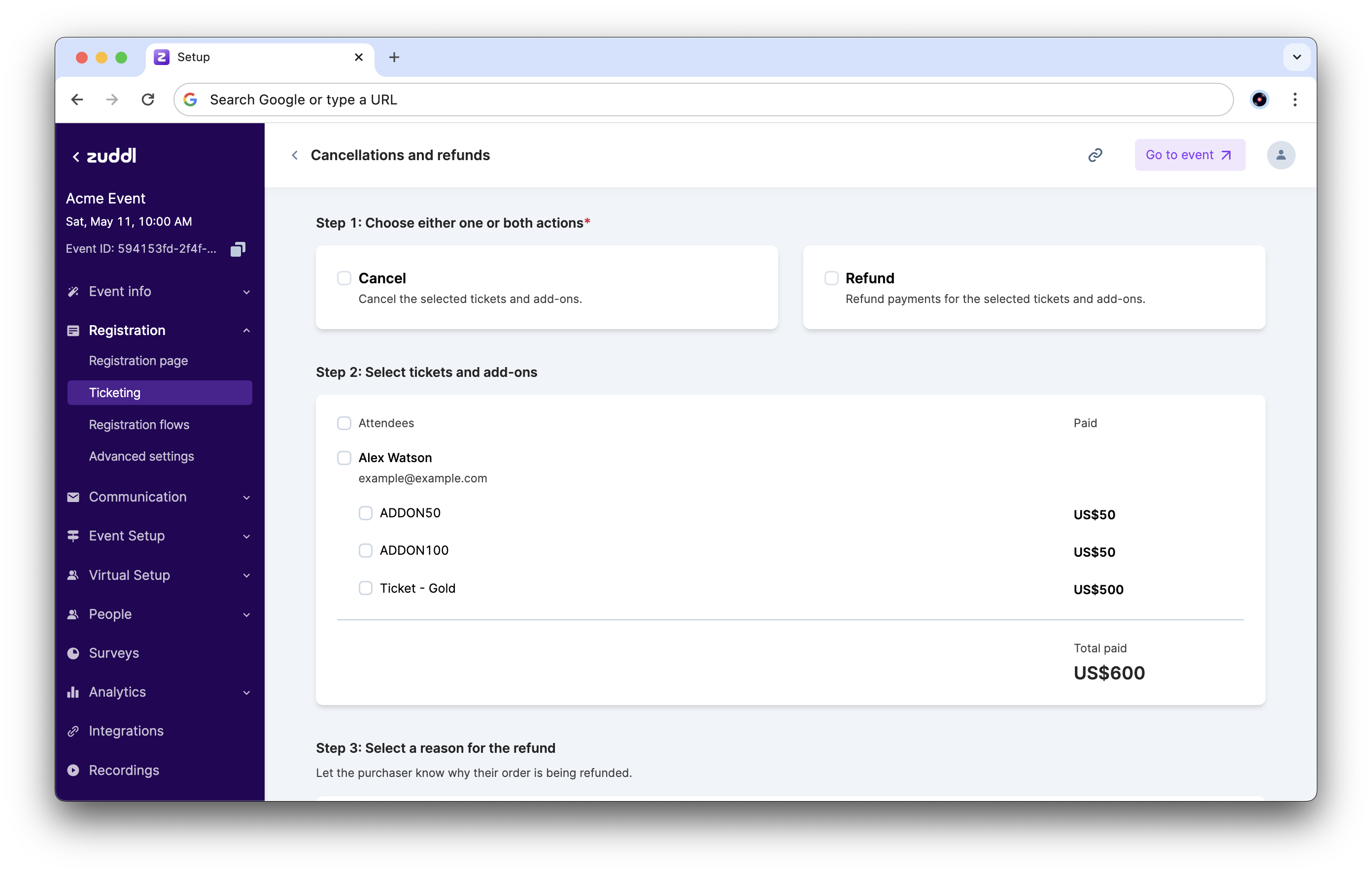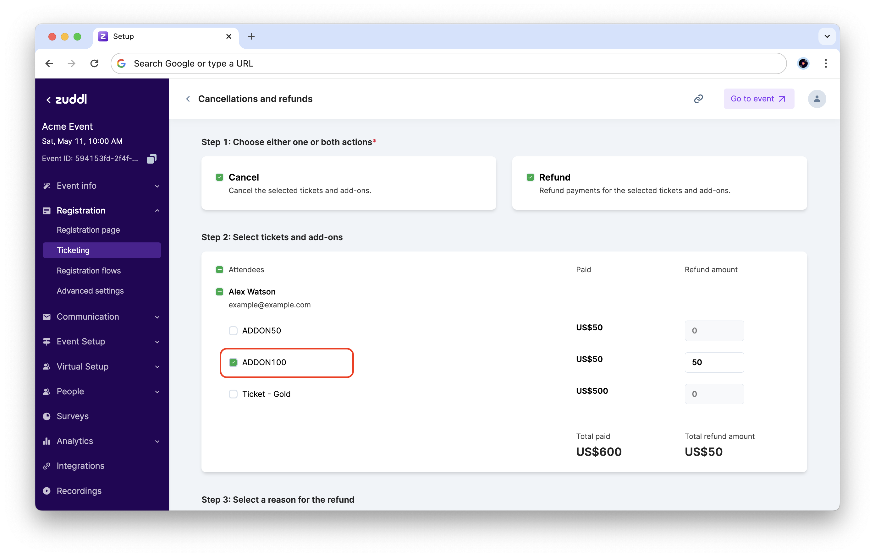 If a specific coupon discount has been applied to any item (tickets or add-ons), the actual Paid amount may vary. When refunding, please refer to the actual amount of the item after the applied discount.