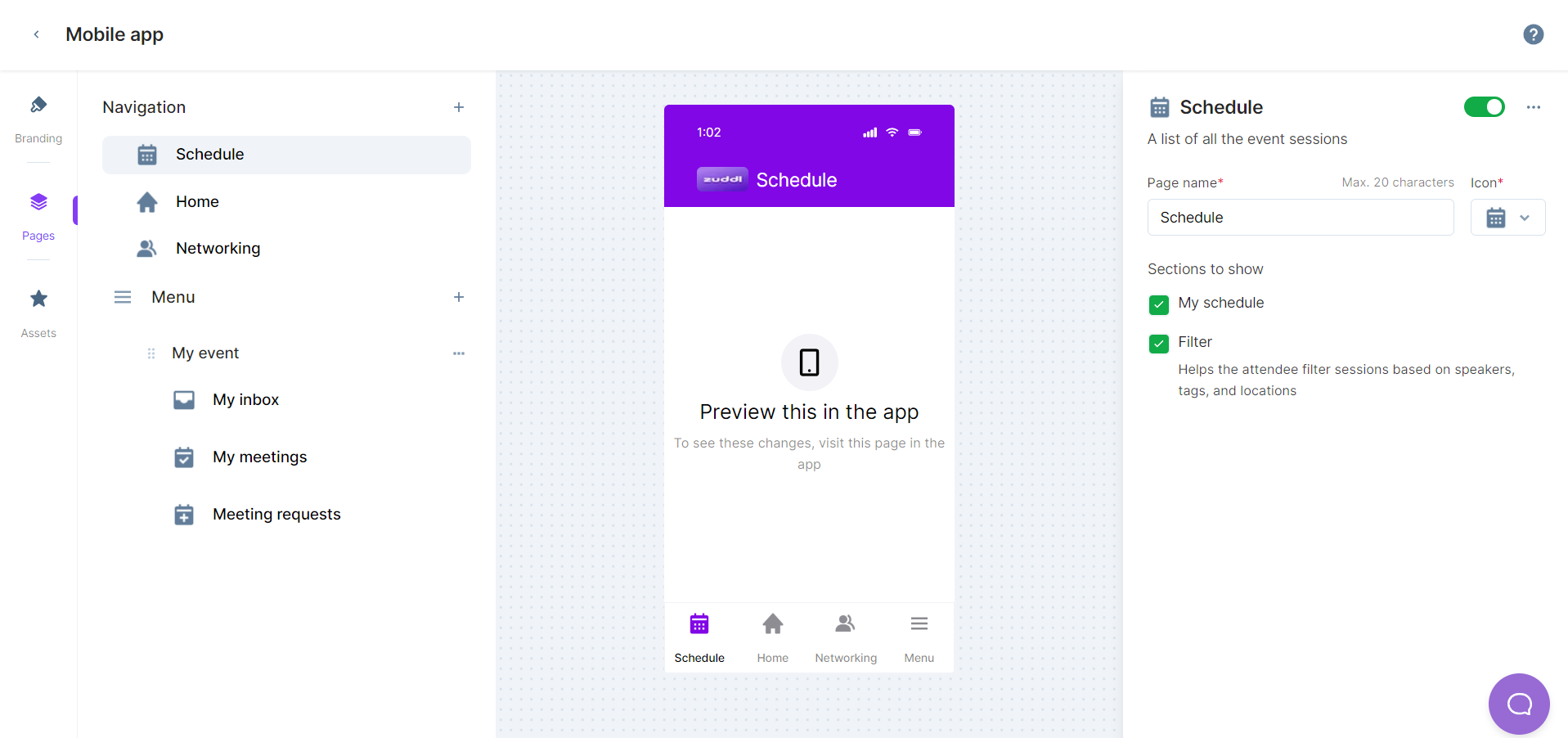 To customize a page, click on the page and edit the details on the right side pane. For example, to edit the Home page, click Home on the right side pane and turn ON/OFF the toggle button to unhide/hide the Home page.