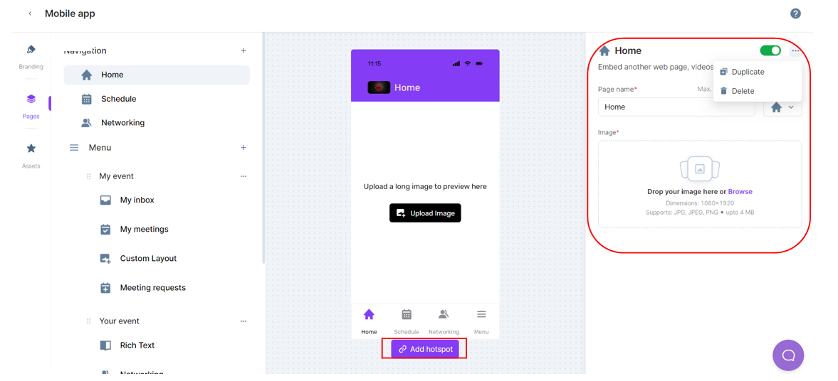 Additionally, you can click on the Add hotspot button to add a hotspot on the Home page. Hotspots can be configured differently for the mobile app and the web app.