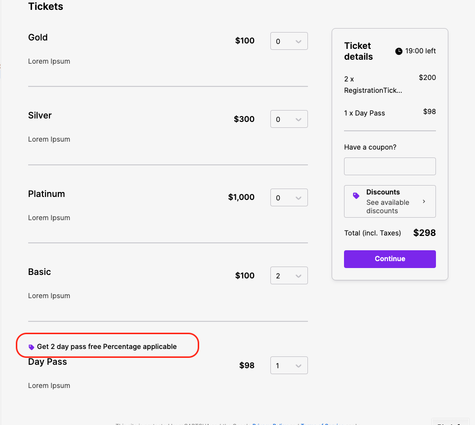 4. When the number of tickets as required by the condition is satisfied, the label says '#discount name applied!' ![]() |