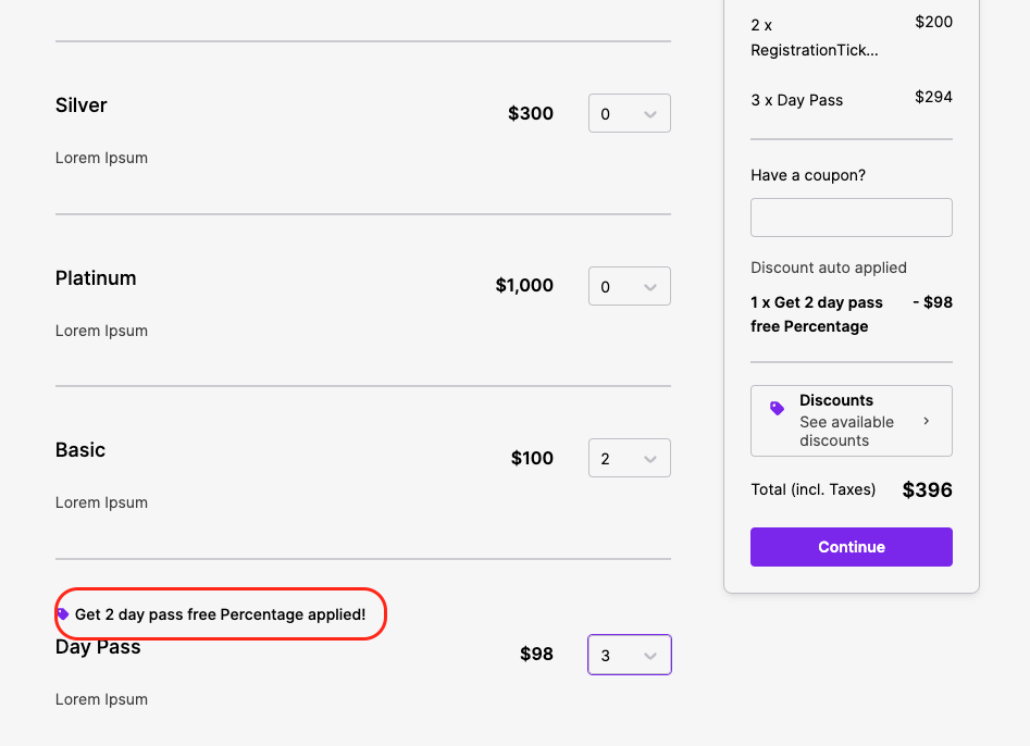 1. Until the required number of tickets are added by the attendee as per the bulk/bundle discount conditions, The available discounts are shown in the Discount section on the right as shown below ![]() | |