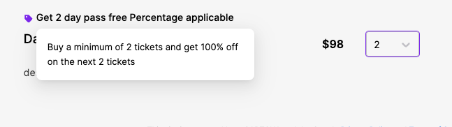2. On the attendee-side, when a bundle discount is applicable for a ticket type, a label appears on the ticket type that says '#discount name applicable' ![]() | 3. When the attendee hovers on the label, the condition statement is shown in a tooltip ![]() |