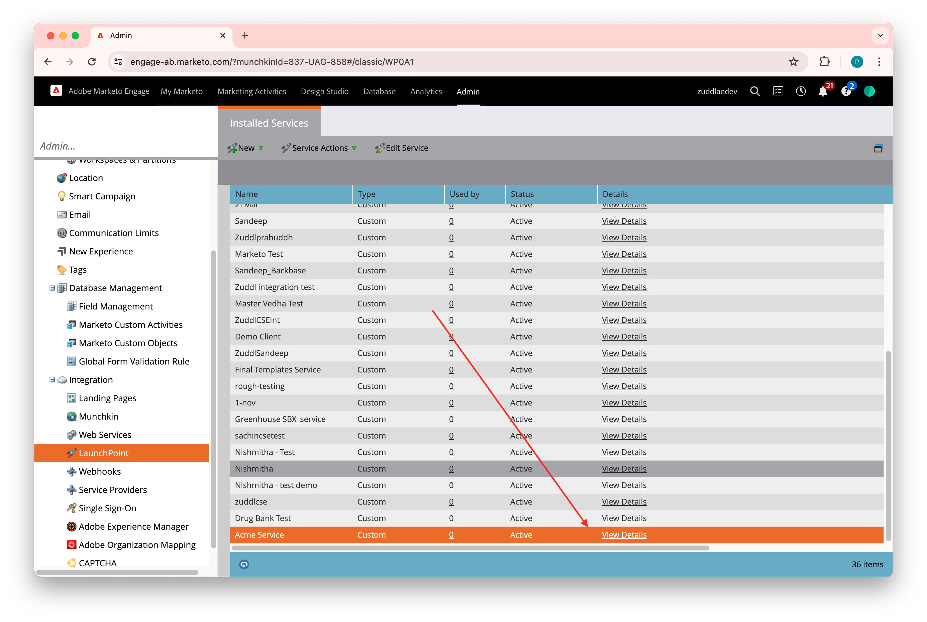 Now, go to LaunchPoint (under Integration). This displays all the LaunchPoint services as Installed Services.