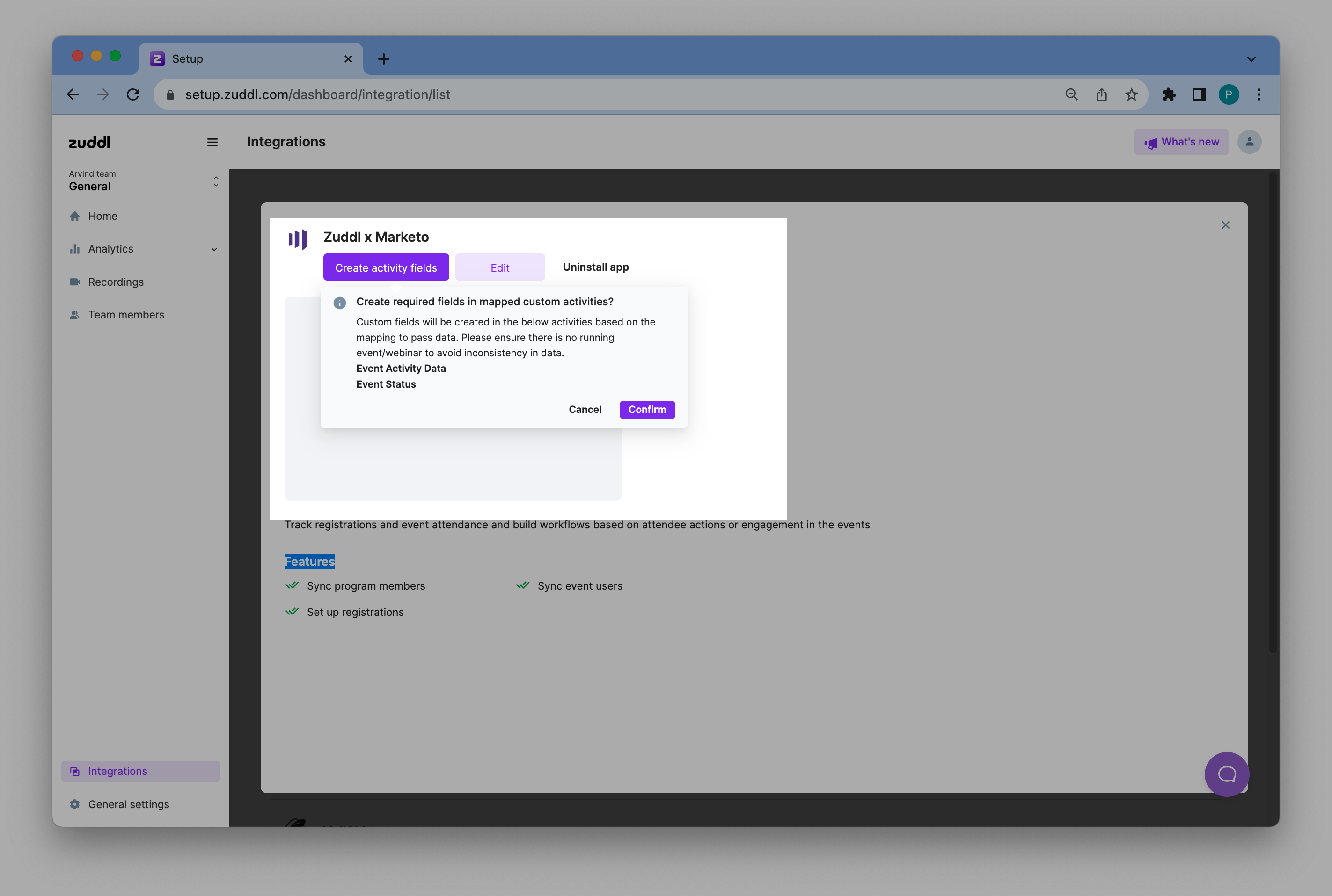 Now click on Create activity fields to create filters for your custom activities. This is a one-time activity that creates fields where Zuddl will pass relevant event activity information.