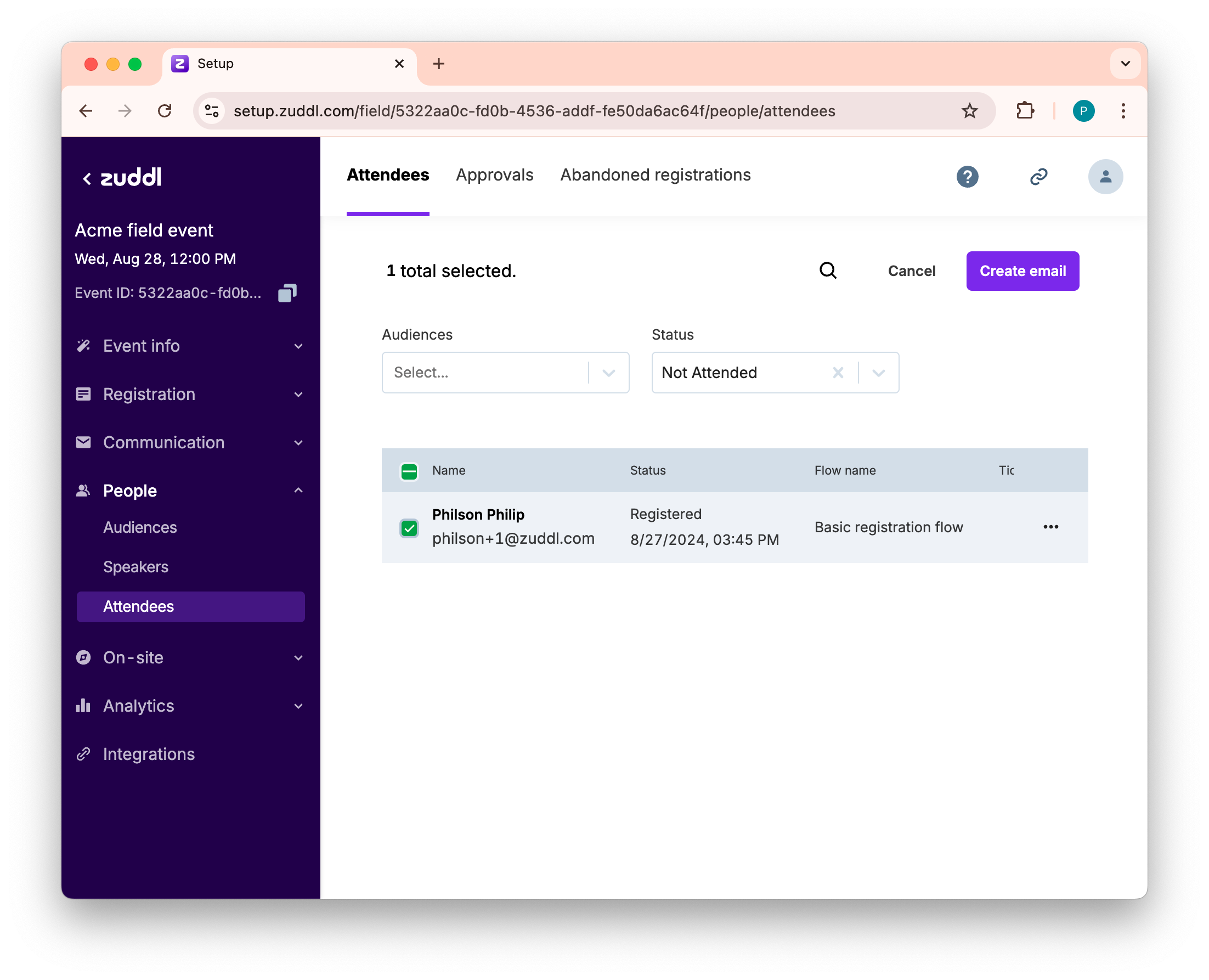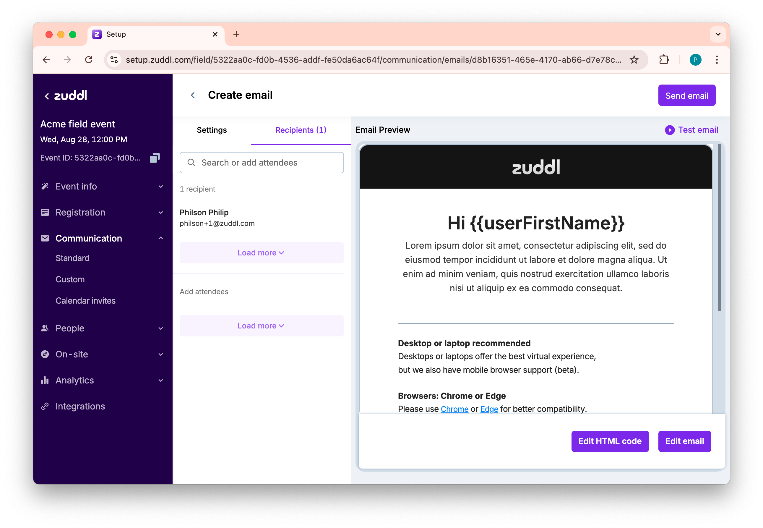 After selecting recipients from the Attendees page and clicking Create email, you can set up the custom email.
