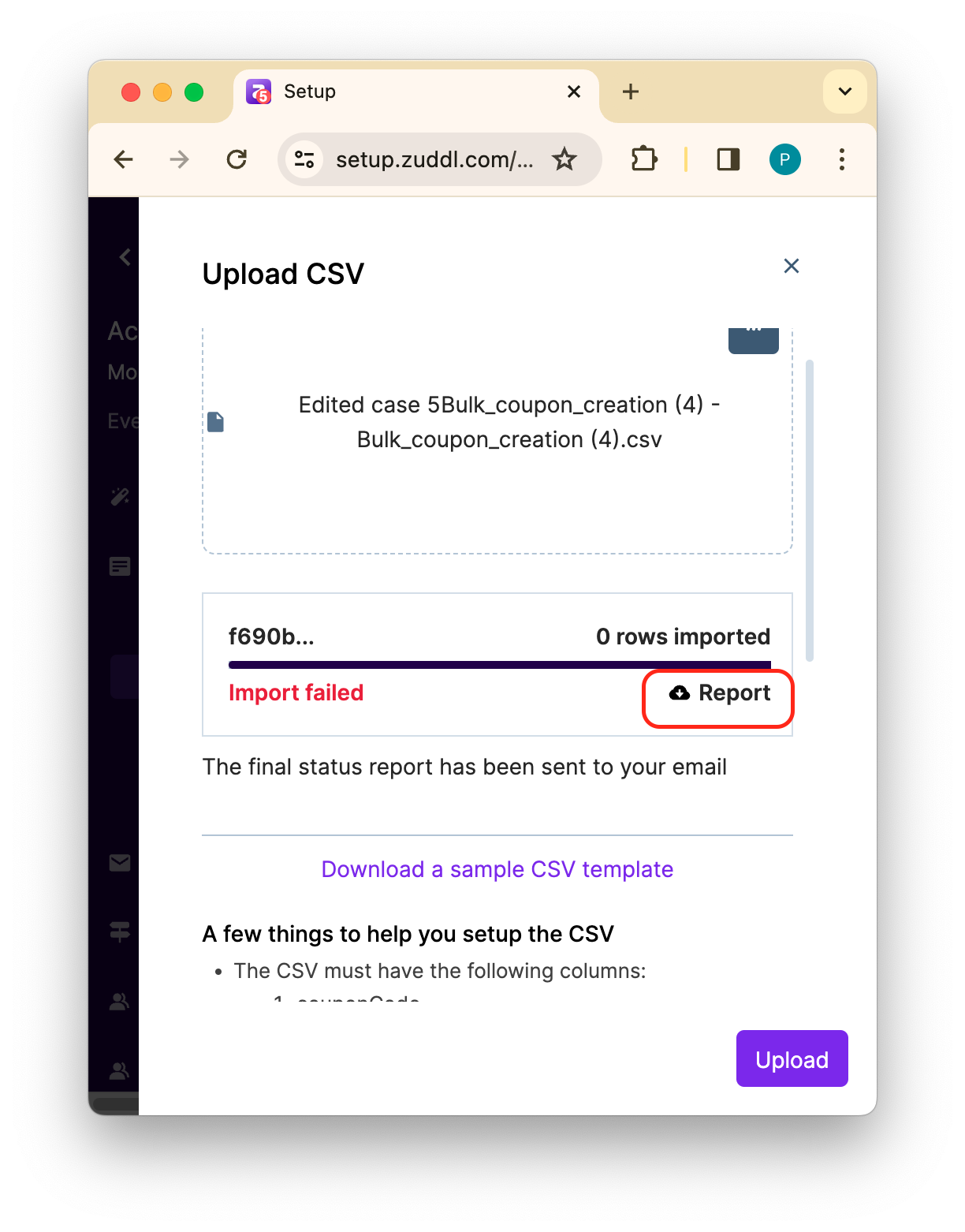 For instance, if 2 out of 3 coupon details were correctly entered in the CSV file, the correct coupons details get uploaded. Zuddl sends you an upload status email wherein you can view the import logs by clicking the Access Import Logs button.