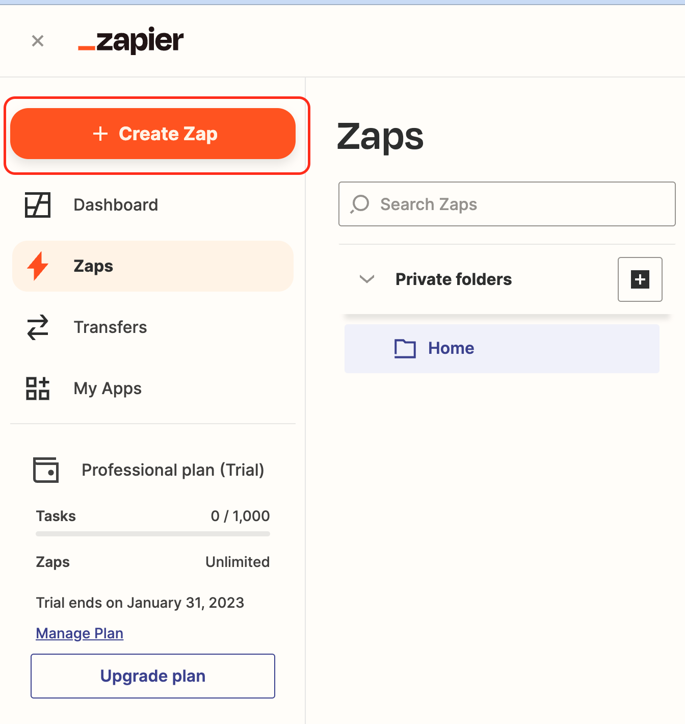 Now go to your Zapier dashboard, click + Create Zap , and select New Zap.
