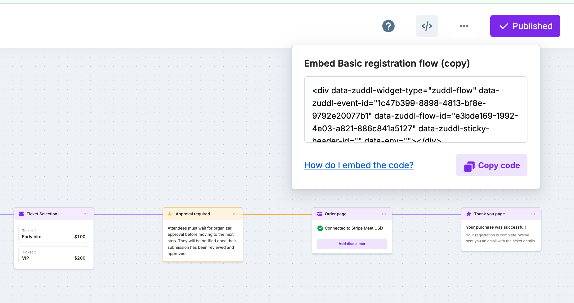 In order to craft the perfect registration experience for your potential attendees, you can utilize the embed option that allows you to host the registration form on your webpage without having your users redirect to a separate URL. After you have built the registration flow, you can embed the flow into your website. To embed the form,