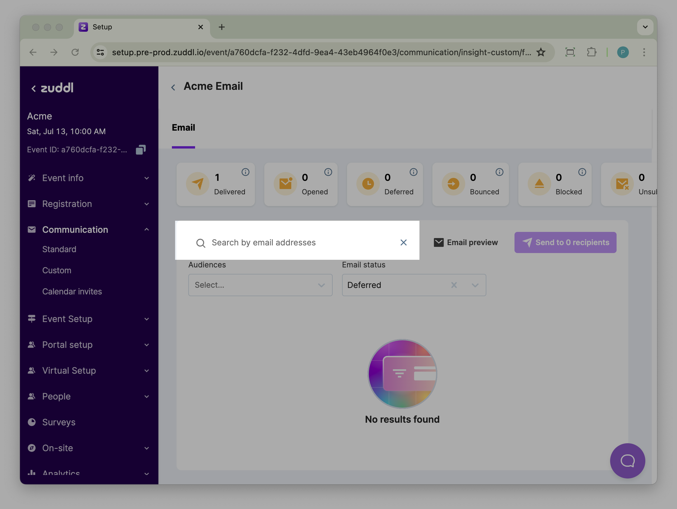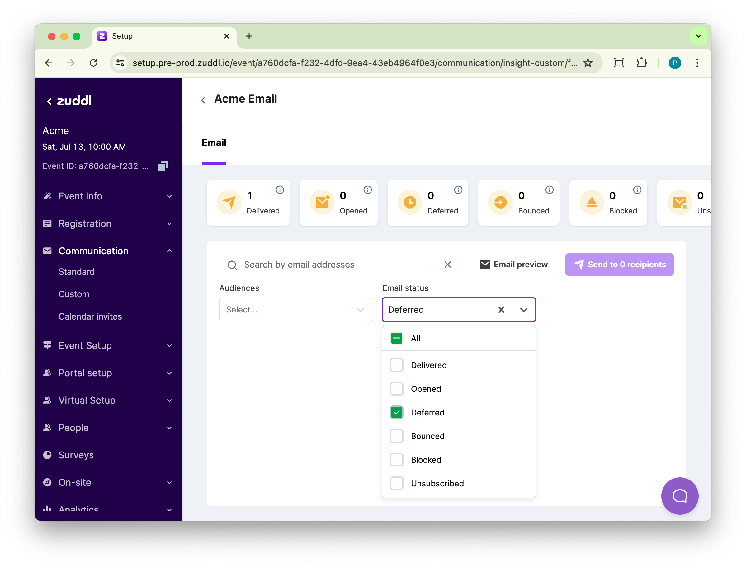 Search for the relevant recipients from the list using filters such as Audiences and Email status. All the email statuses are listed in the dropdown.