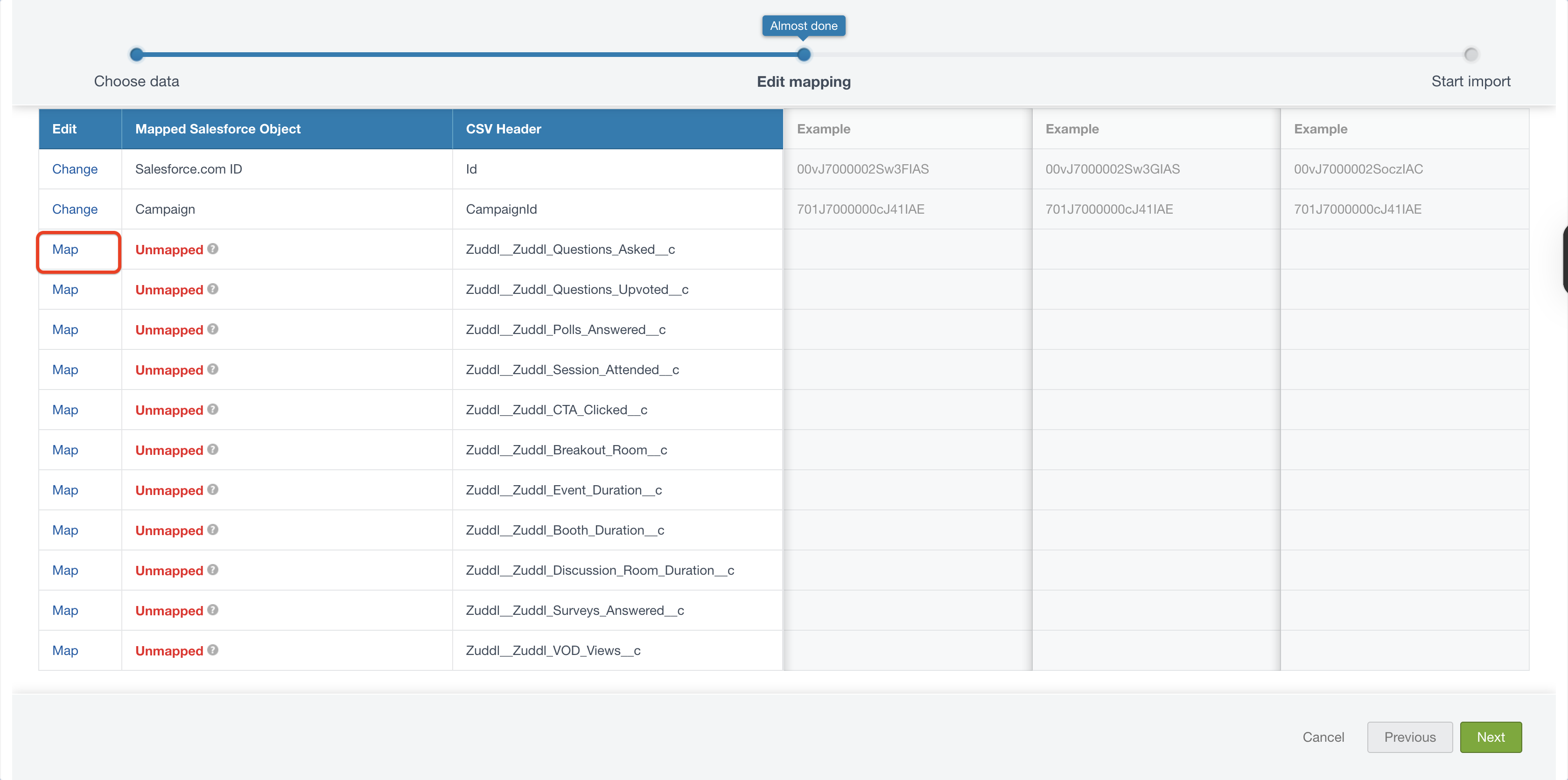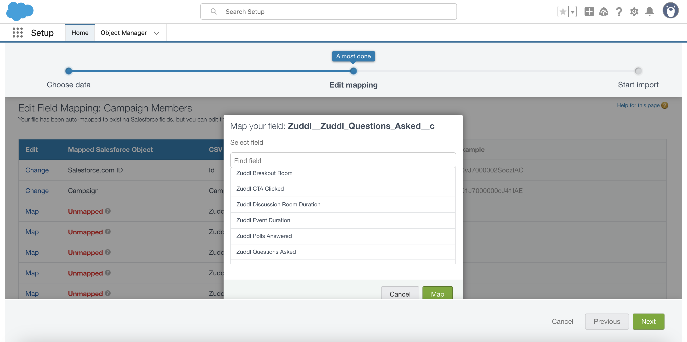 In the fields mapping step, click on ‘Map’ corresponding to each CSV Header and map the respective CampaignMember object fields.