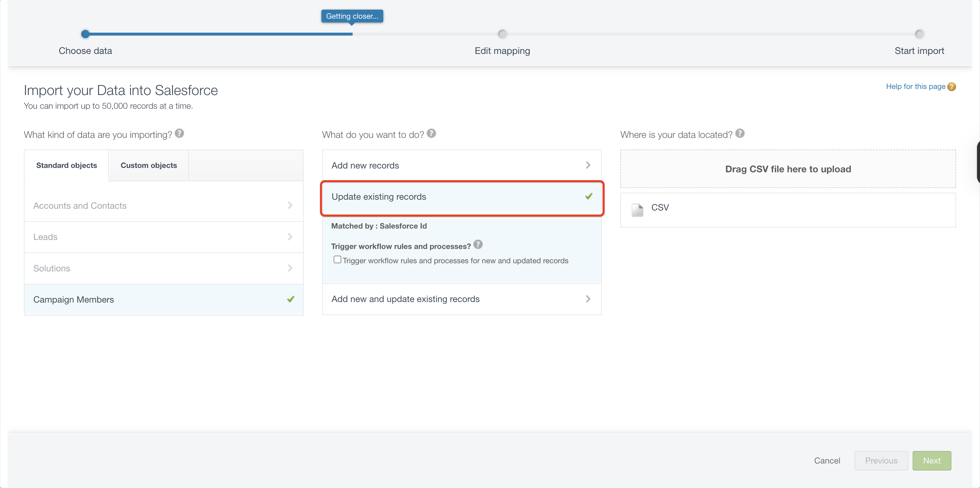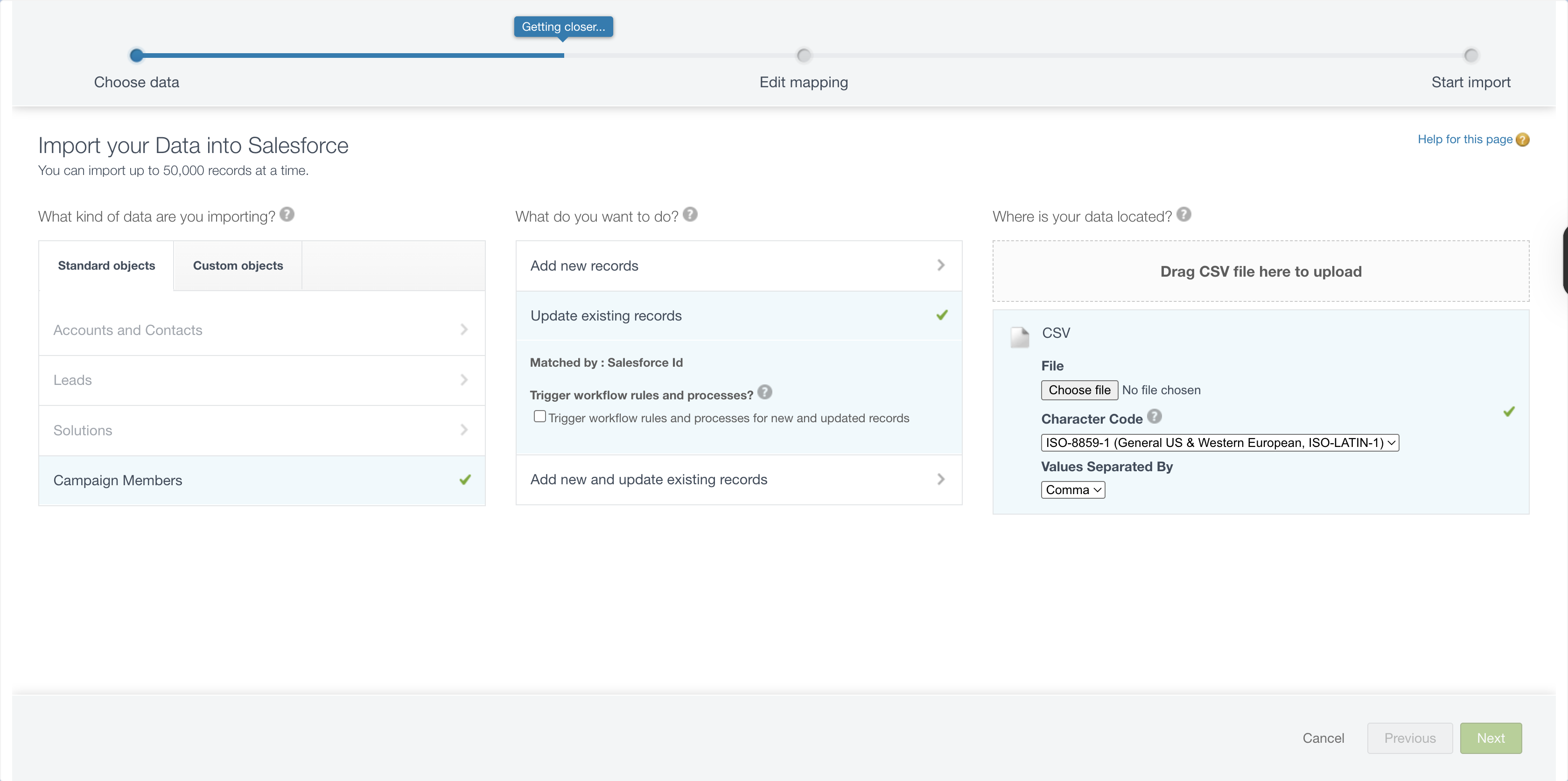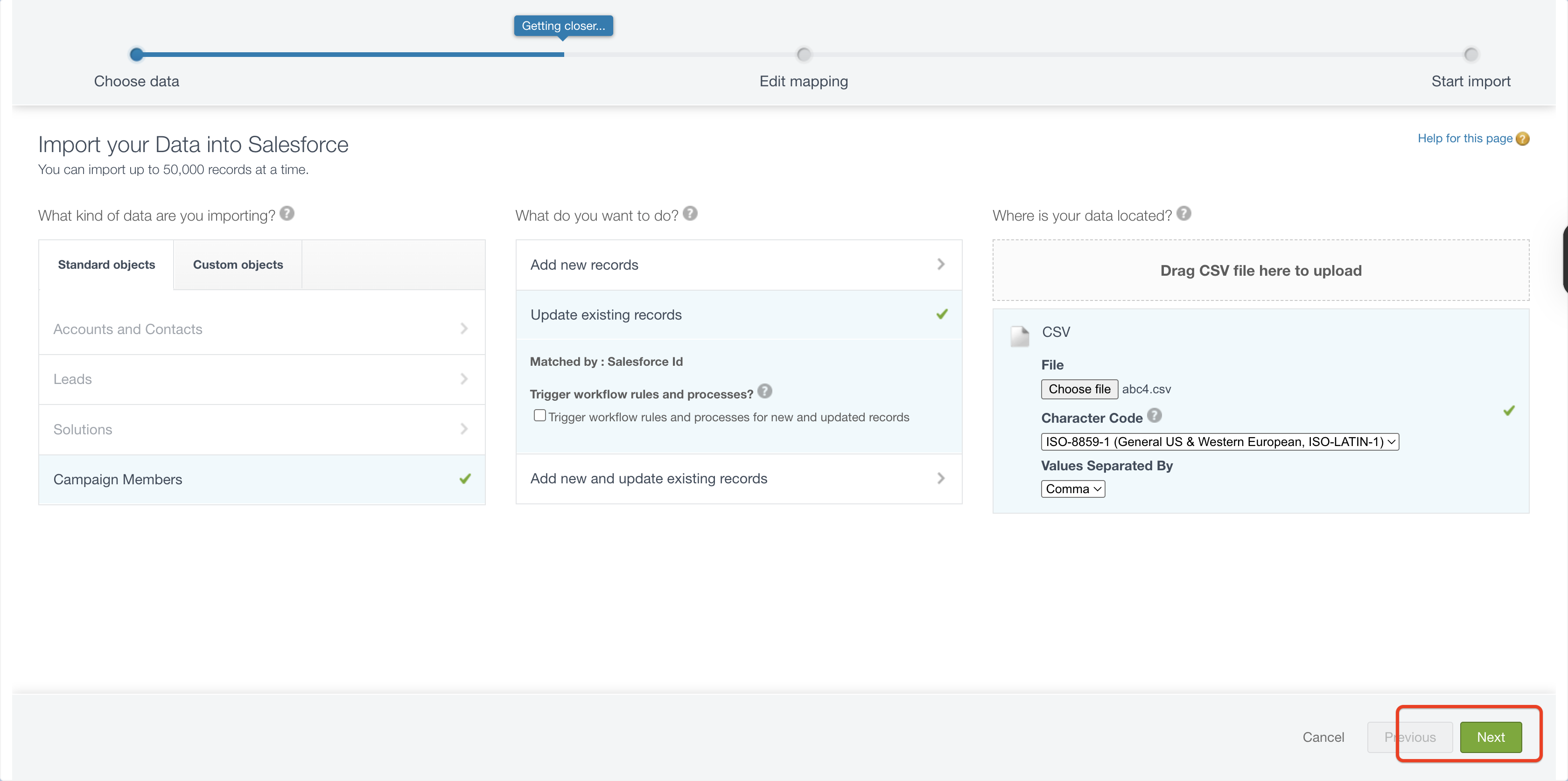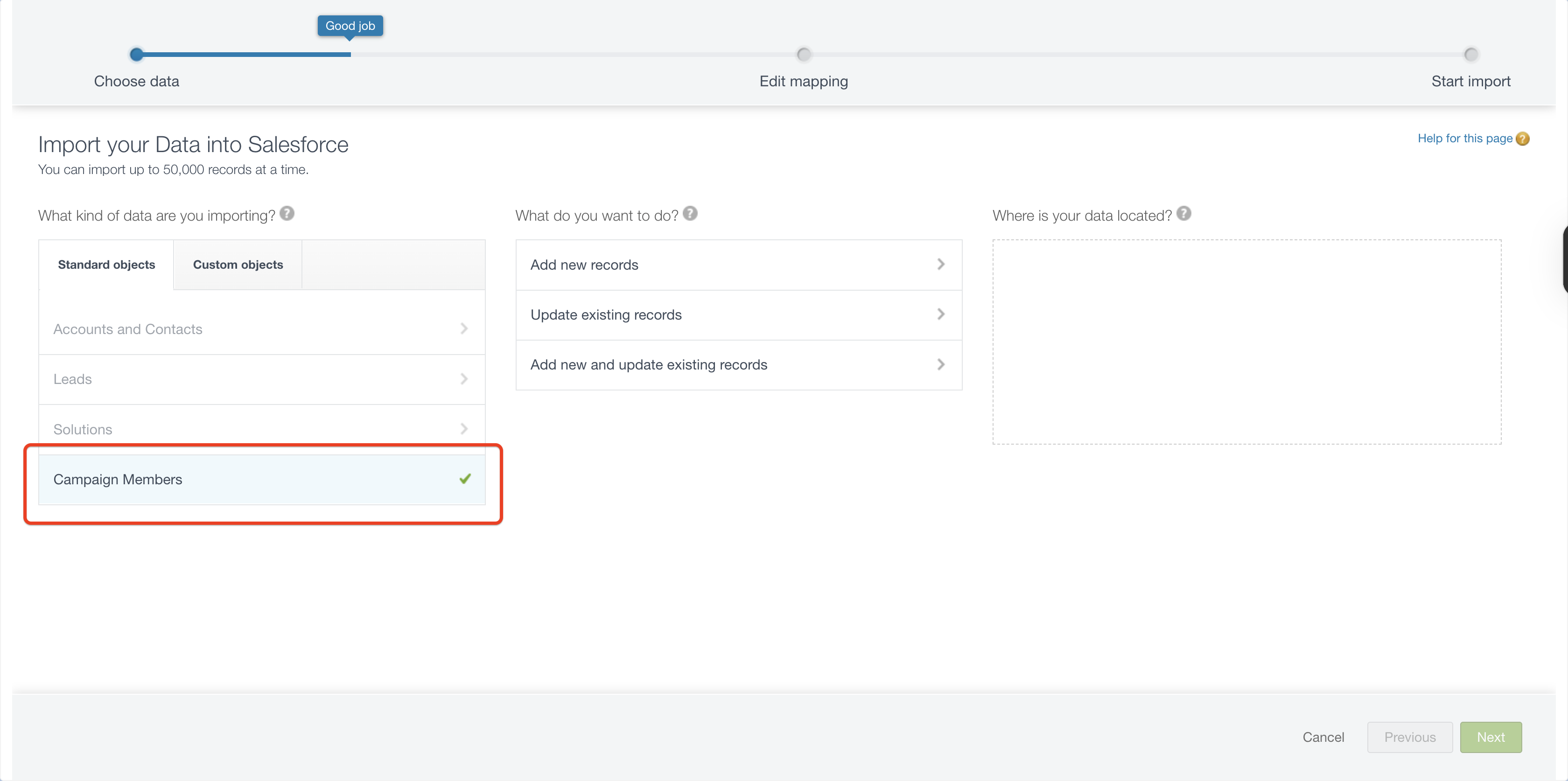 After installing the required managed package, follow the steps below to import the data to the CampaignMember object.