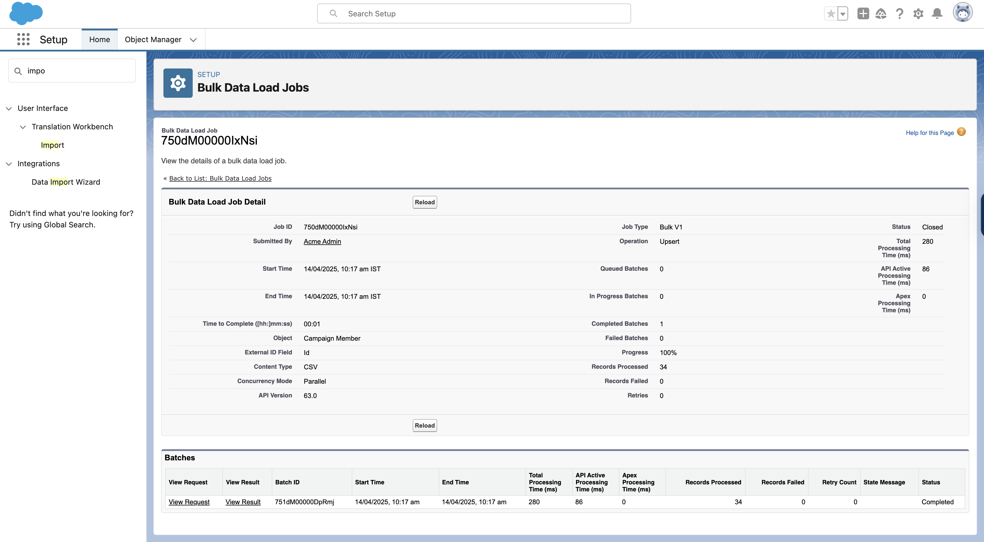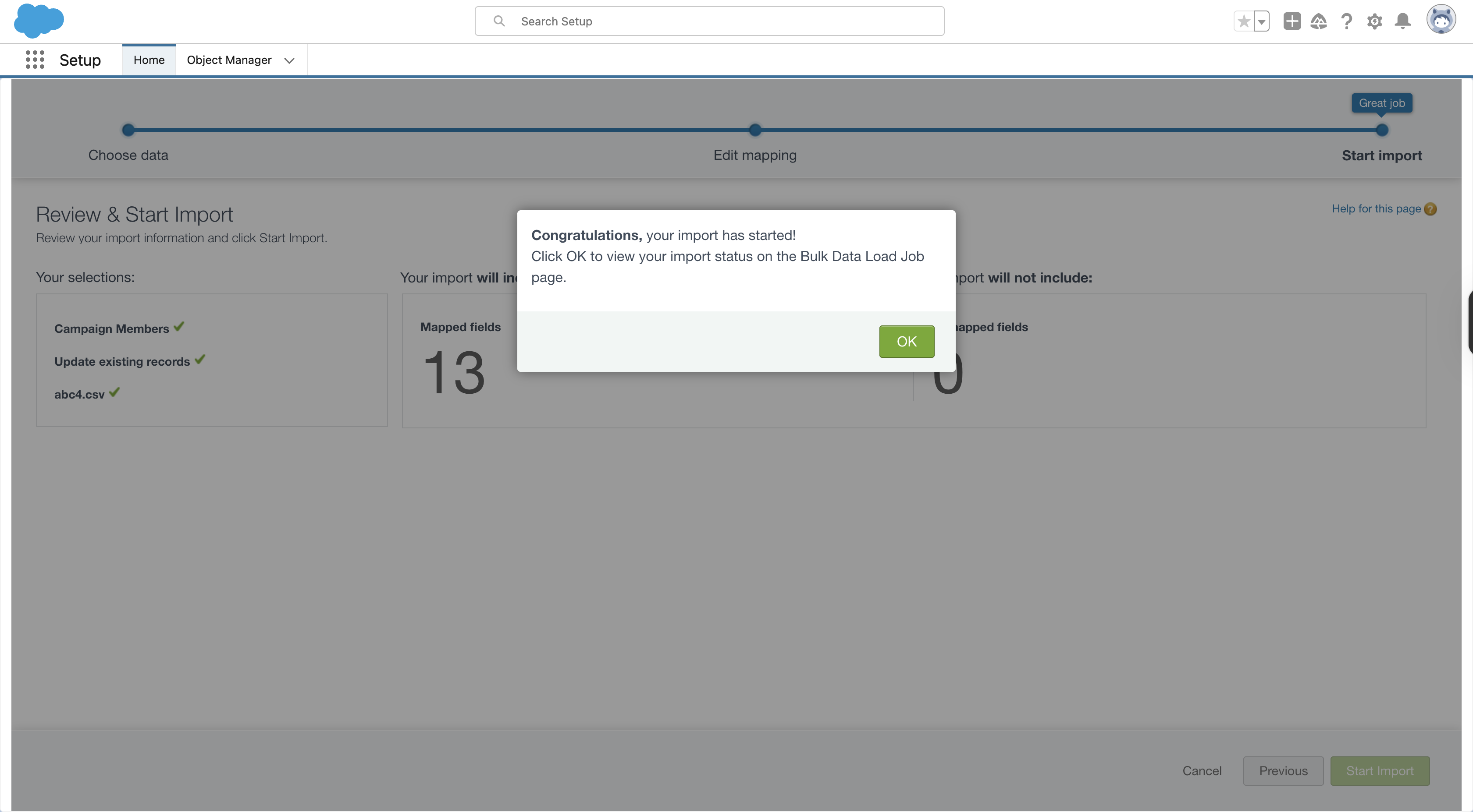 In the next step, click on ‘Ok’ to see the import status and all the other details of Bulk Data Load Job.