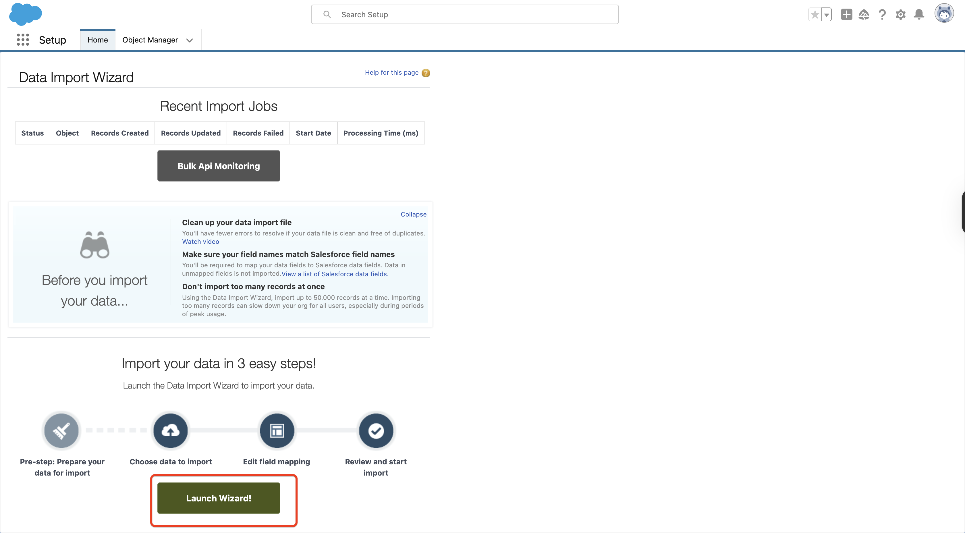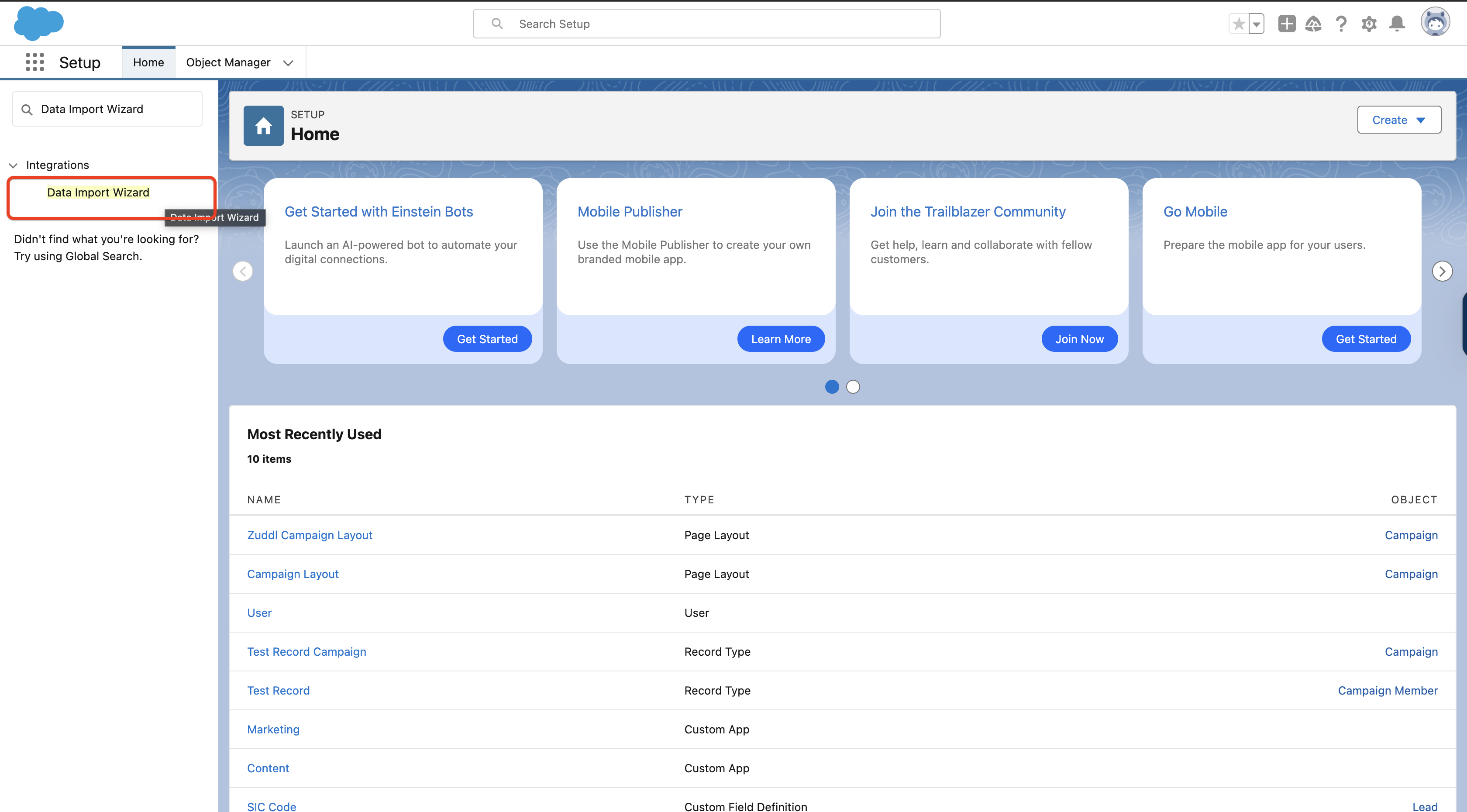 On your Salesforce Setup page, search for ‘Data Import Wizard’ and click on ‘Data Import Wizard’ under Integrations on the left navigation.