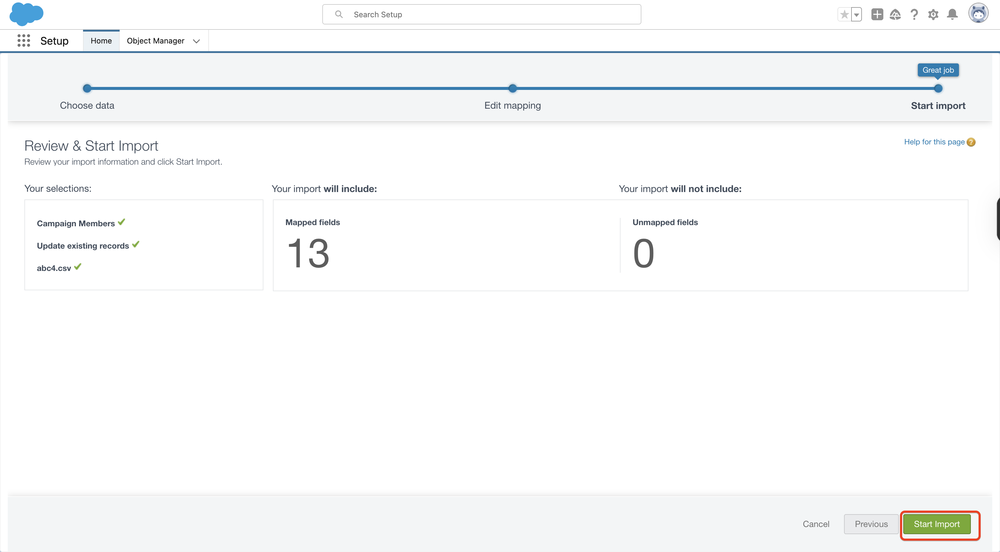 Once the fields are mapped, a summary screen appears highlighting the object that you are trying to update, the records of that object that will get updated, and the count of columns that have been mapped/unmapped. Once you’ve verified the settings, click on ‘Start Import’.