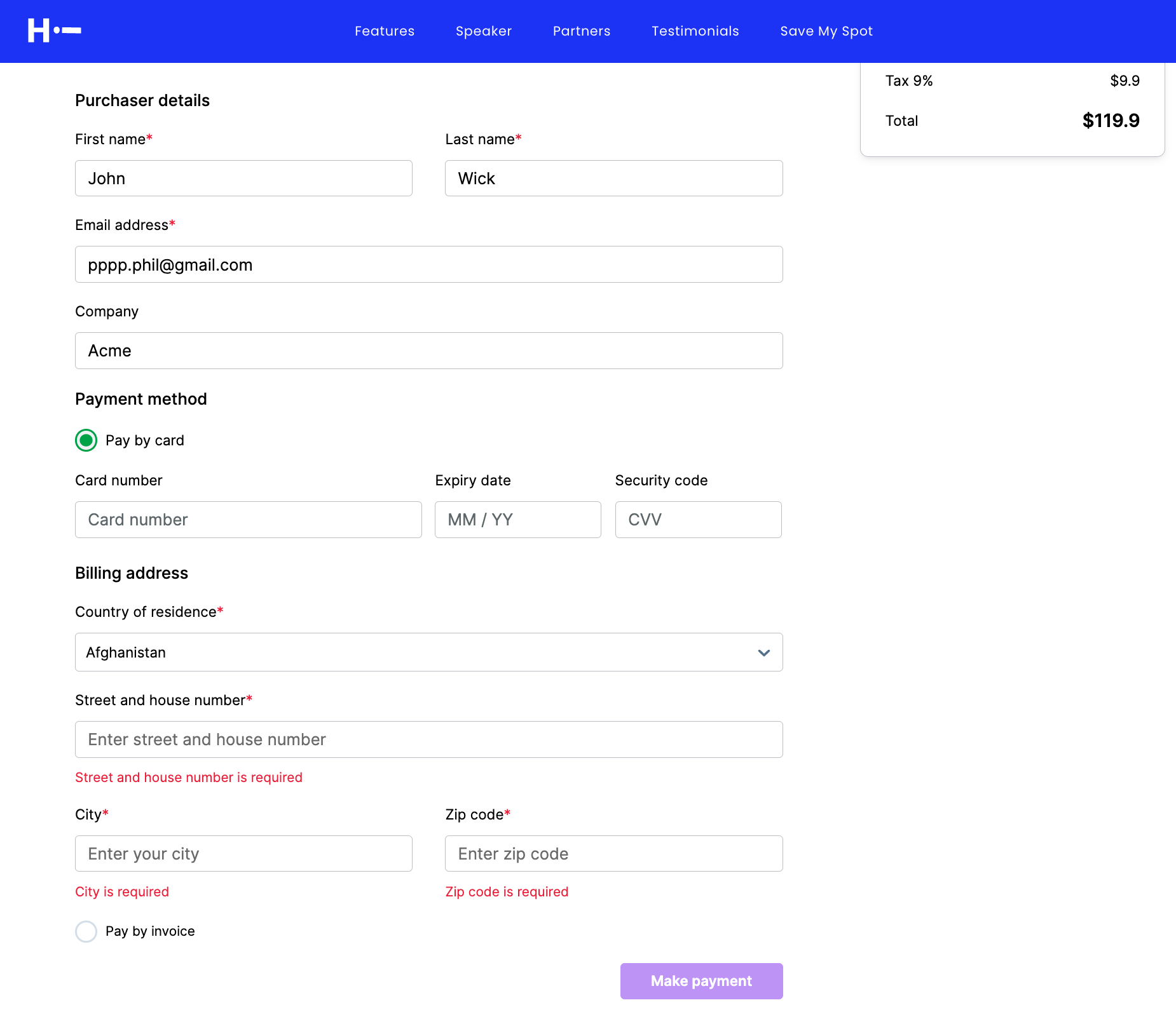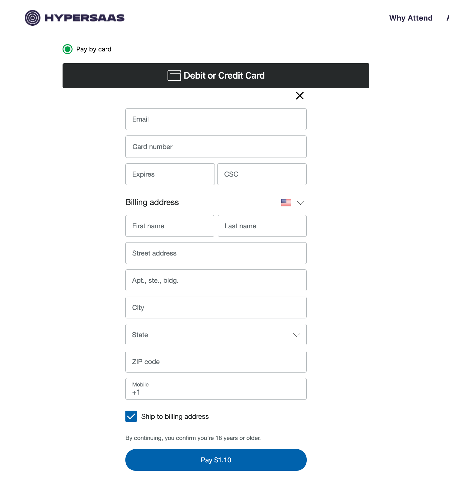 If your account is eligible for Advanced Checkout, your registrants will see the Advanced Checkout flow, where all card details are captured on the Zuddl UI, keeping the branding intact.