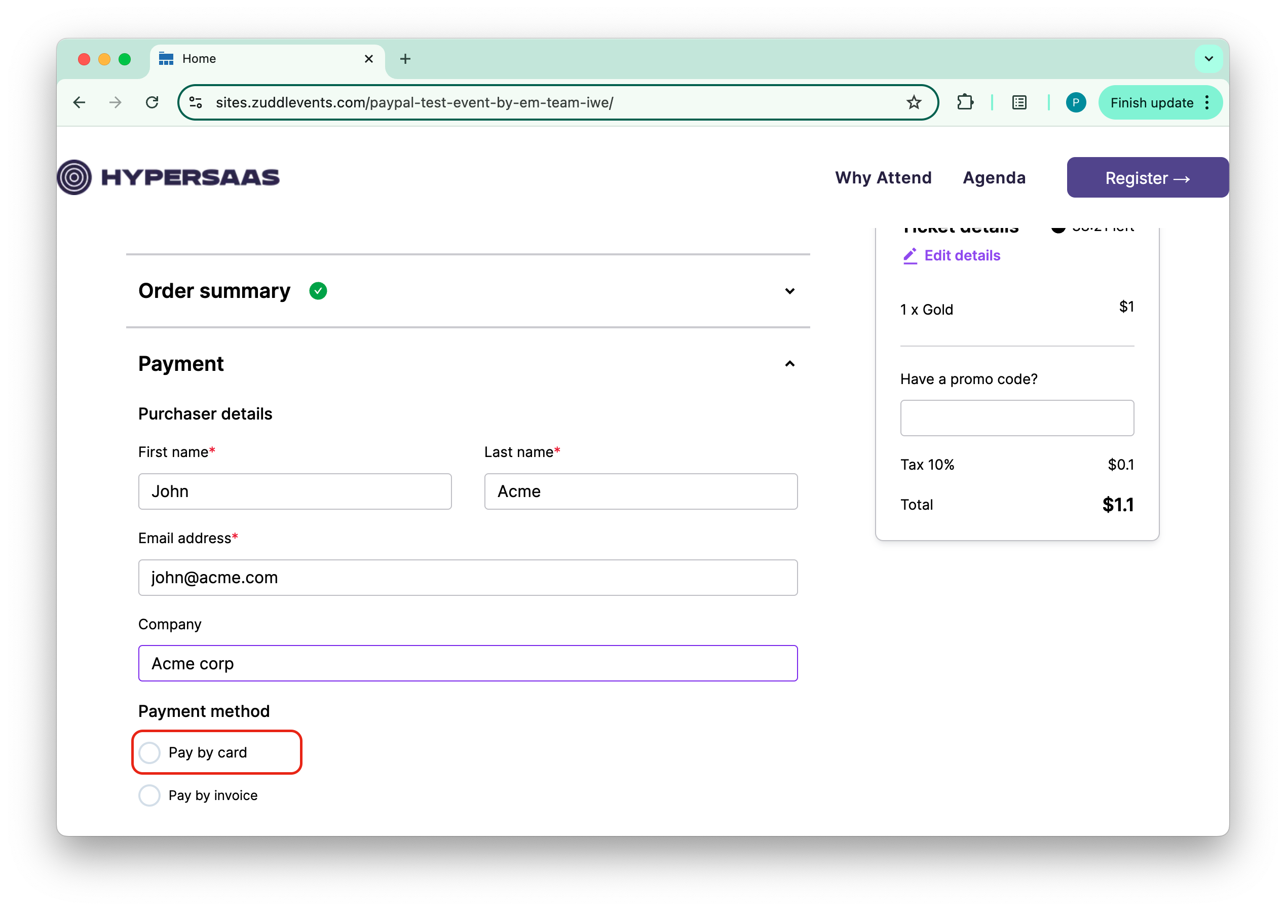 On the checkout screen, after the purchaser has entered her/his details, the purchaser clicks the Pay by card radio button to proceed with the PayPal checkout. This article explains the checkout flow with PayPal as the merchant account for your Zuddl account.