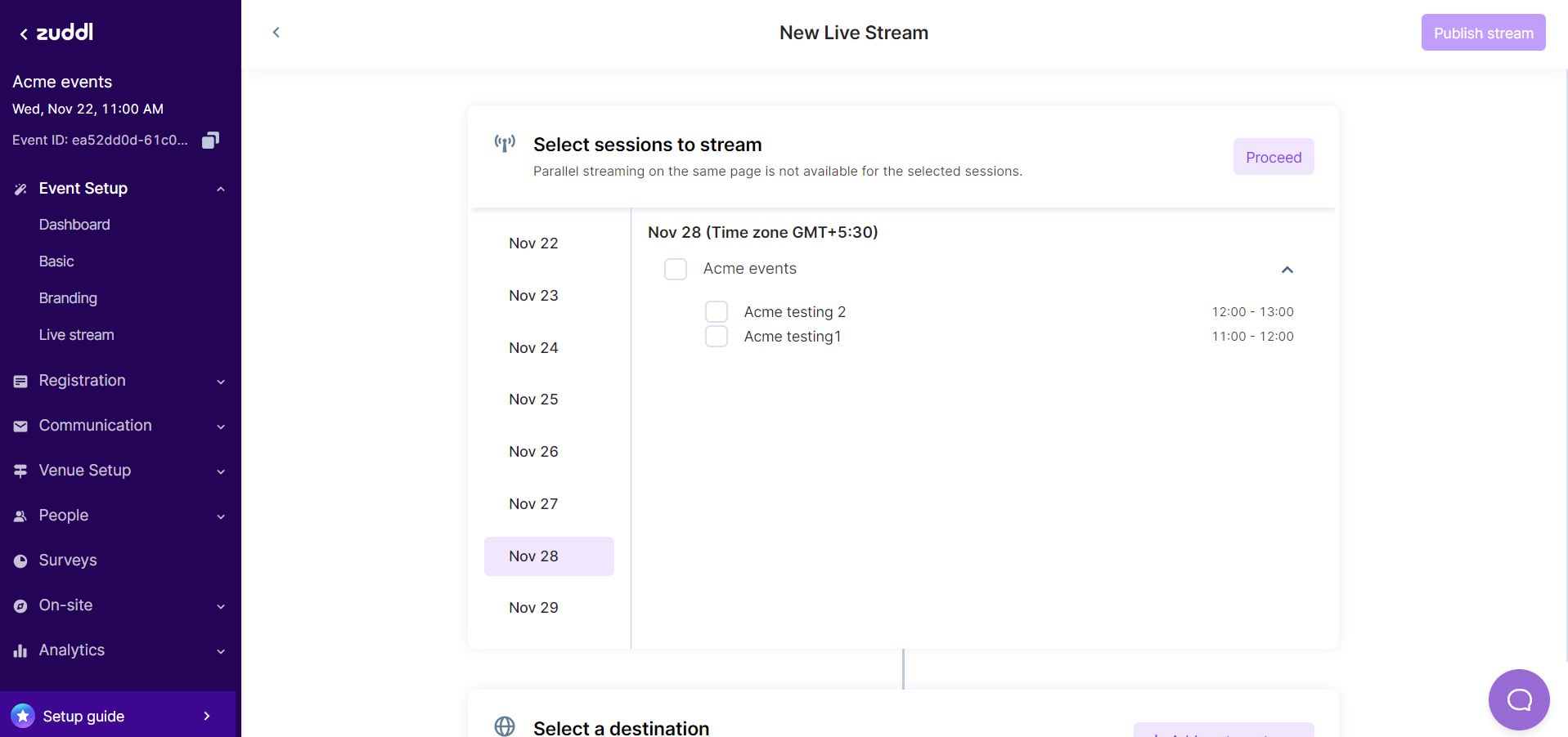 On the session selection screen, the sessions are displayed date-wise. On the navigation scroll bar, select the date for the session you want to stream. The sessions scheduled for the selected date and the stage name appear on the right as checkboxes.