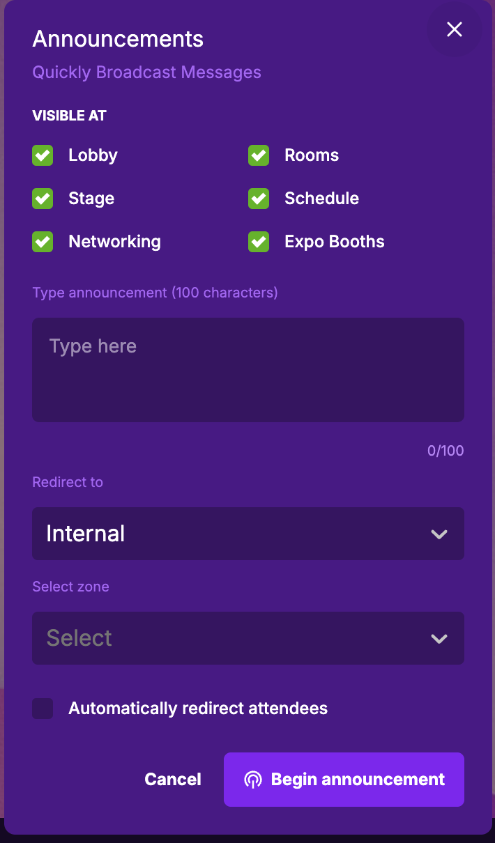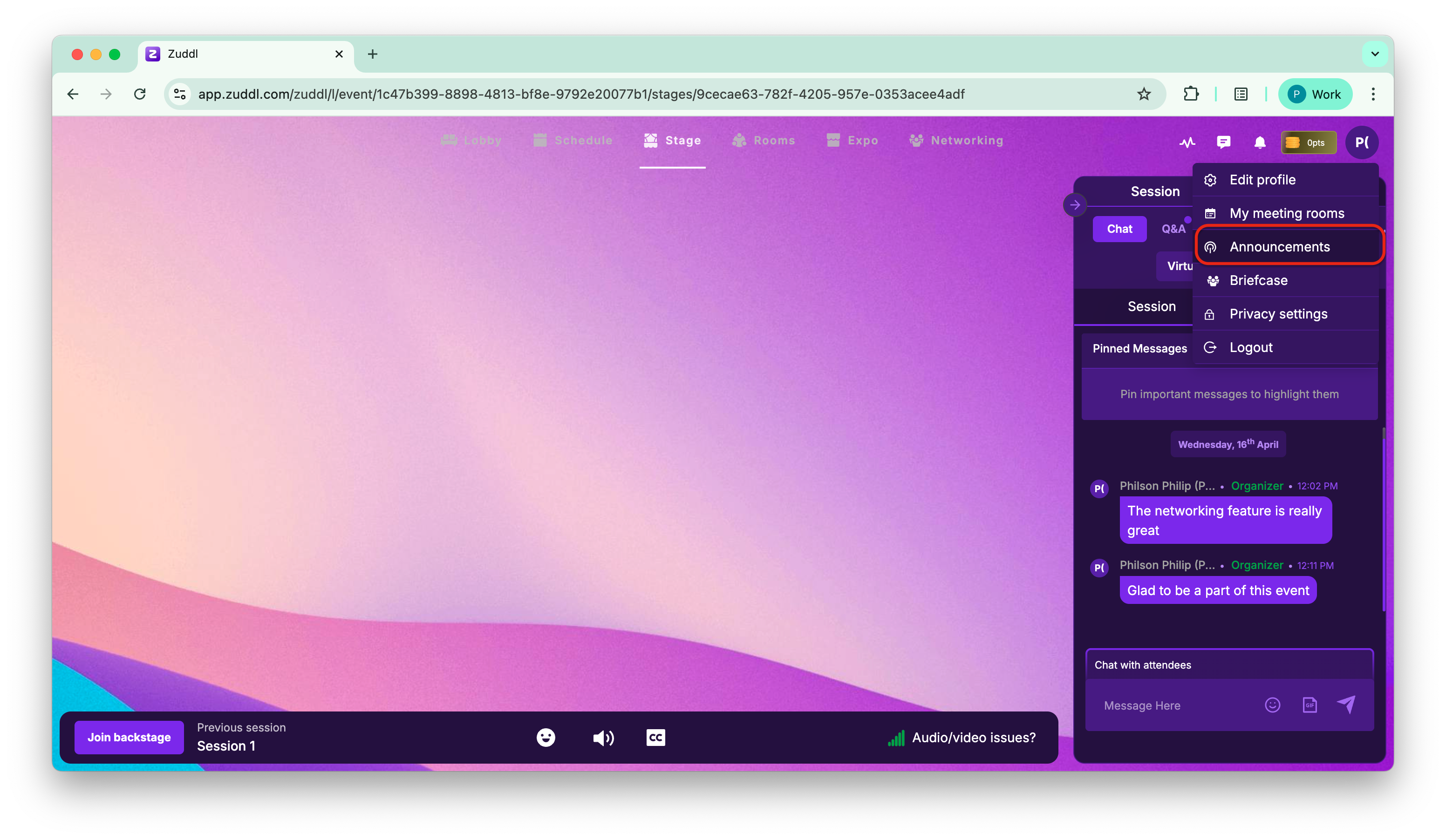 Organizers can easily create and send announcements to attendees from backstage during a live event. You can also use this option to redirect users to a venue within Zuddl or any external link.