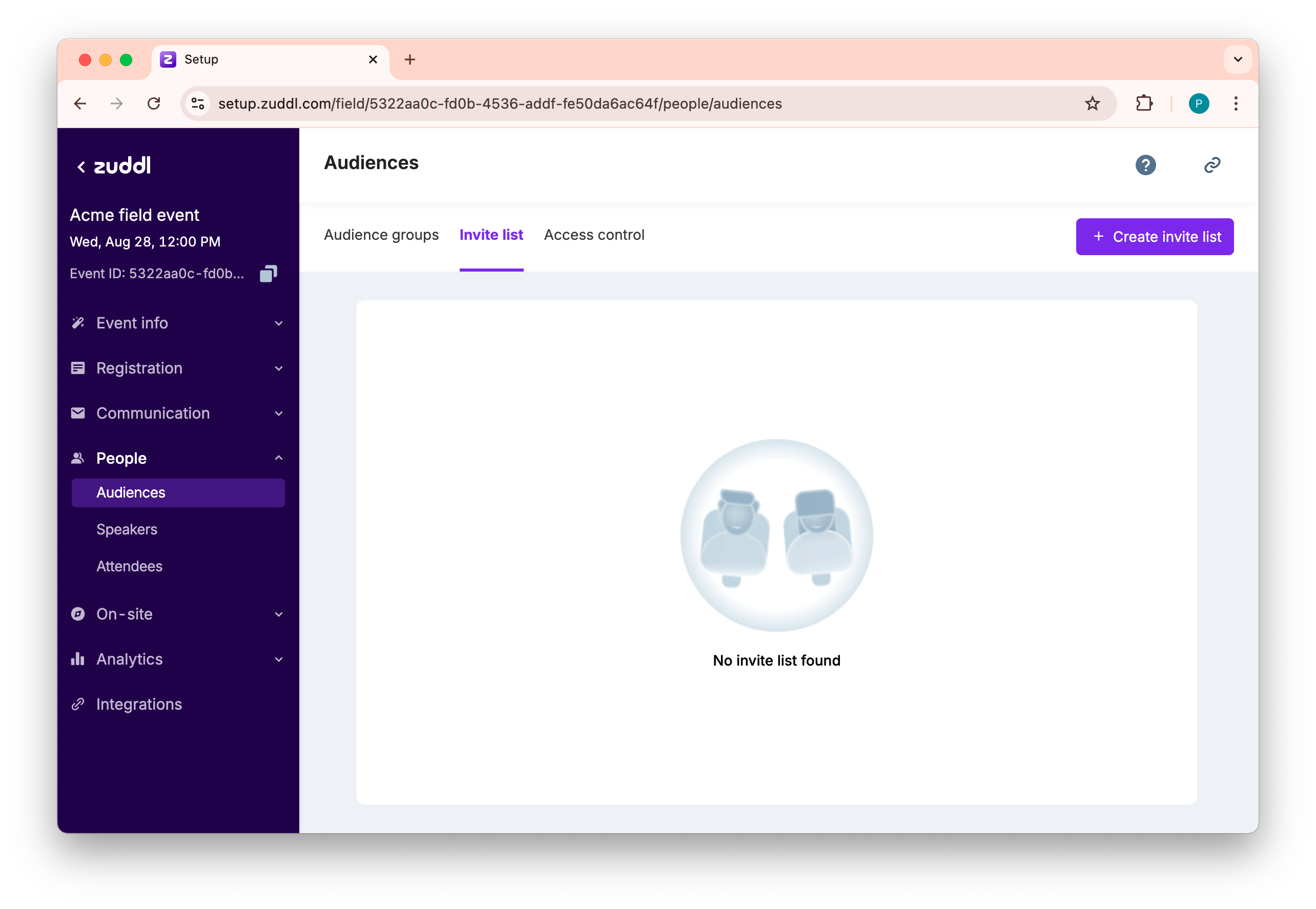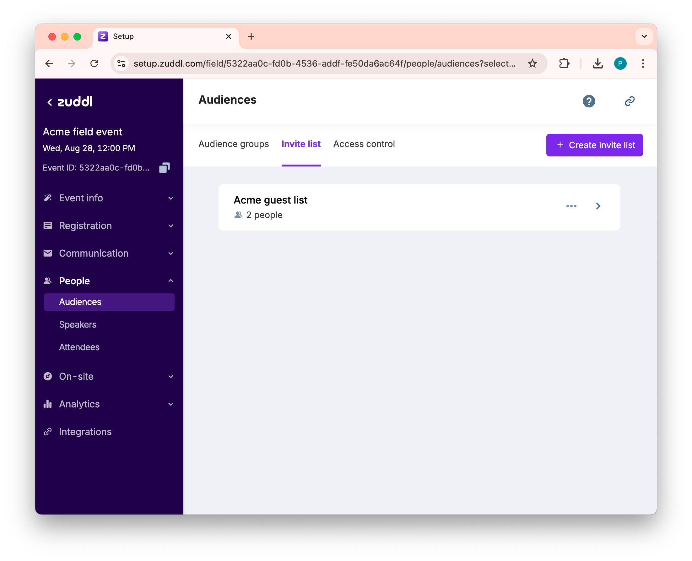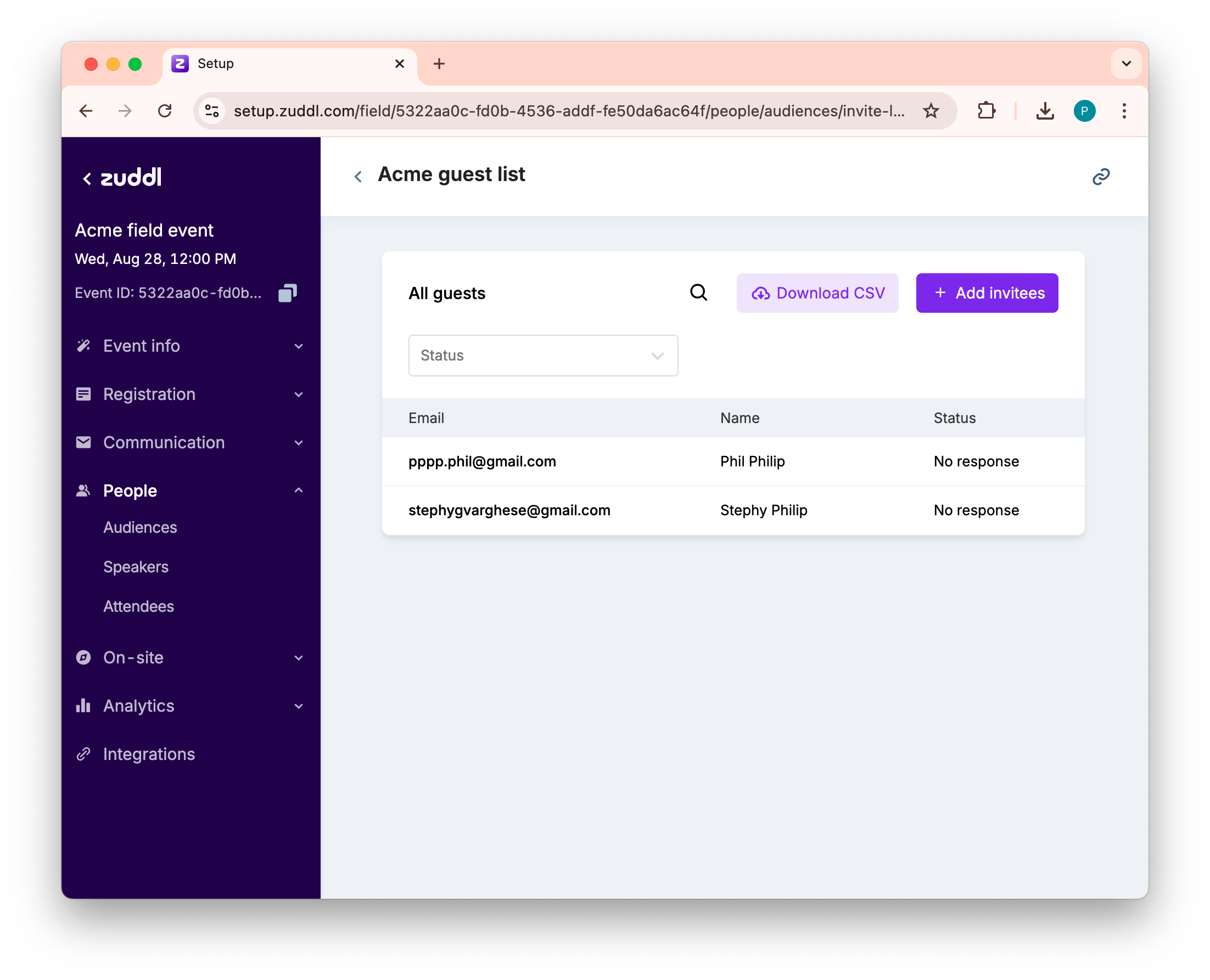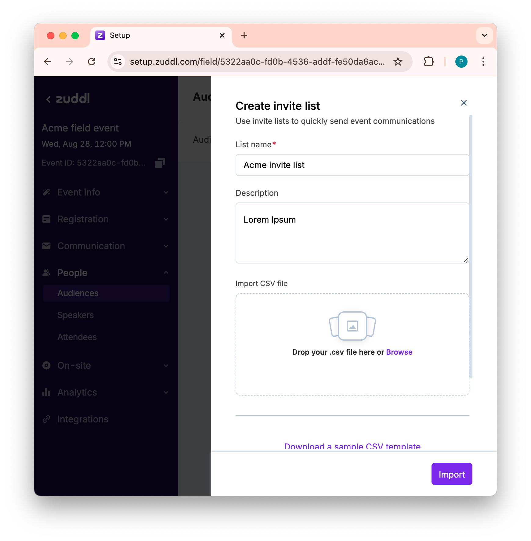 An Invite list is a list of email addresses uploaded to Zuddl in CSV format. Invite lists can be used to invite guests to register for an event. Once people register for the event using the invitation, they are added to the relevant audience groups. An invite list can also be used to send email communication to people who have not registered for an event. For example, you can create an invite list for an event's admin team and send them custom communication, such as event invites, special instructions, and so on.