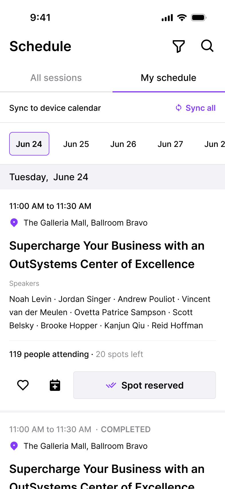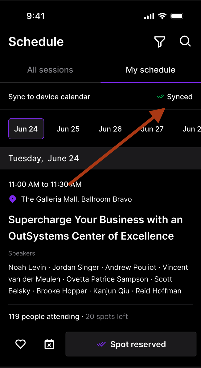 This creates a reminder for all your sessions under My schedule on your personal calendar. The Sync all button also gets updated to Synced.