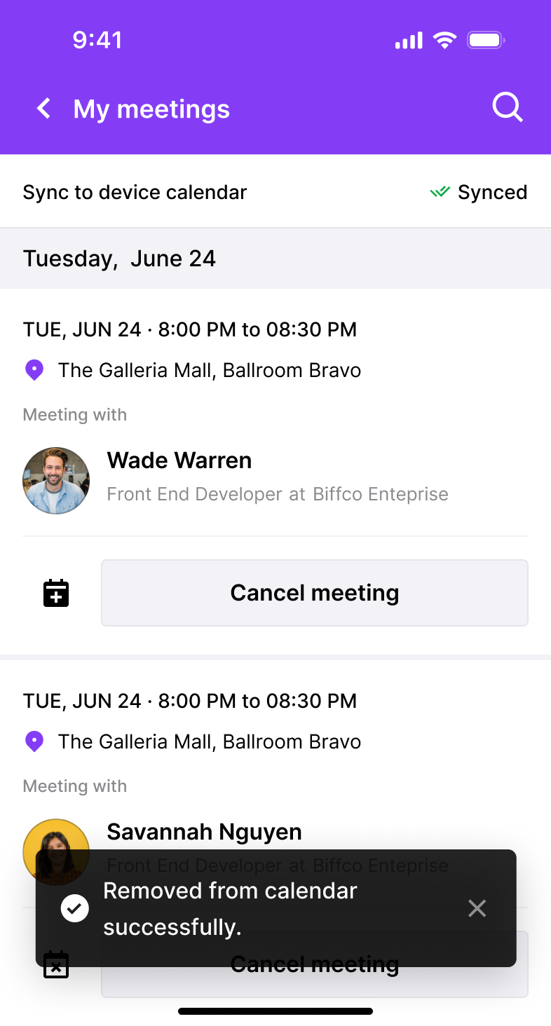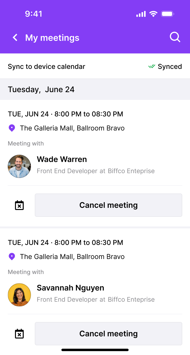 Using the calendar sync feature attendees you can add reserved sessions and meetings to your personal calendar on your mobile phone. This helps attendees to stay notified of the sessions and meeting in Zuddl.