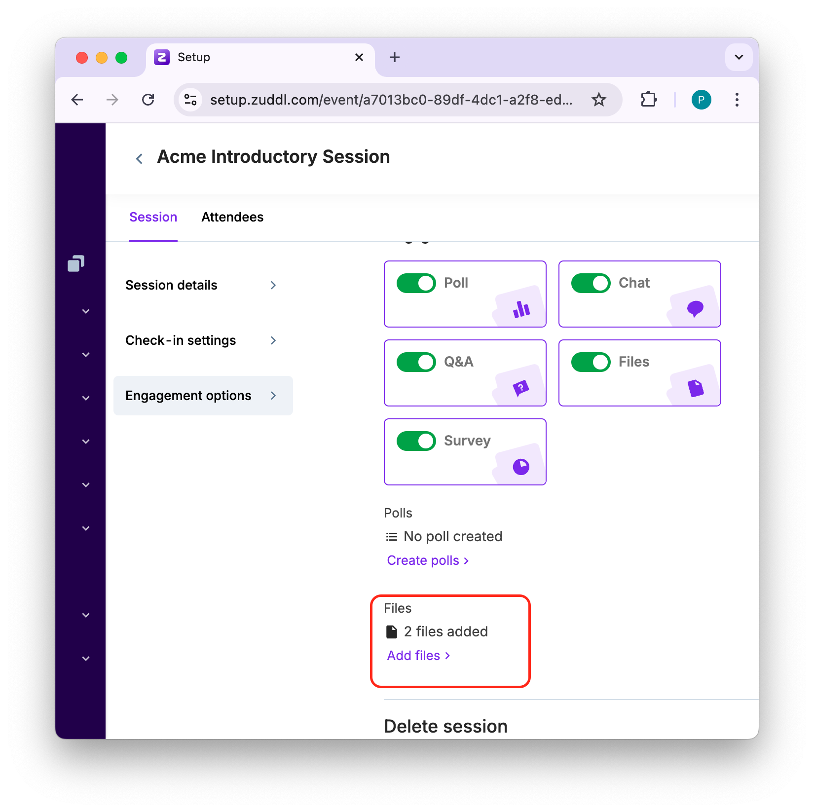 Files allow you to add pre-loaded files for your session speaker which can be used during the session. To add files: