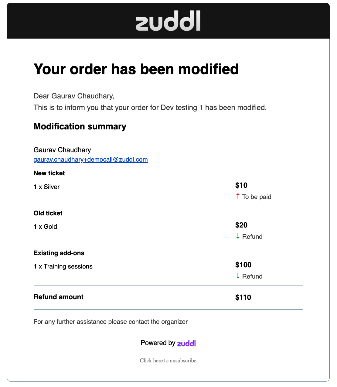 When changes have been made to an order, communicating the same to the purchaser and attendee is important. When you modify an order, the following emails are sent: