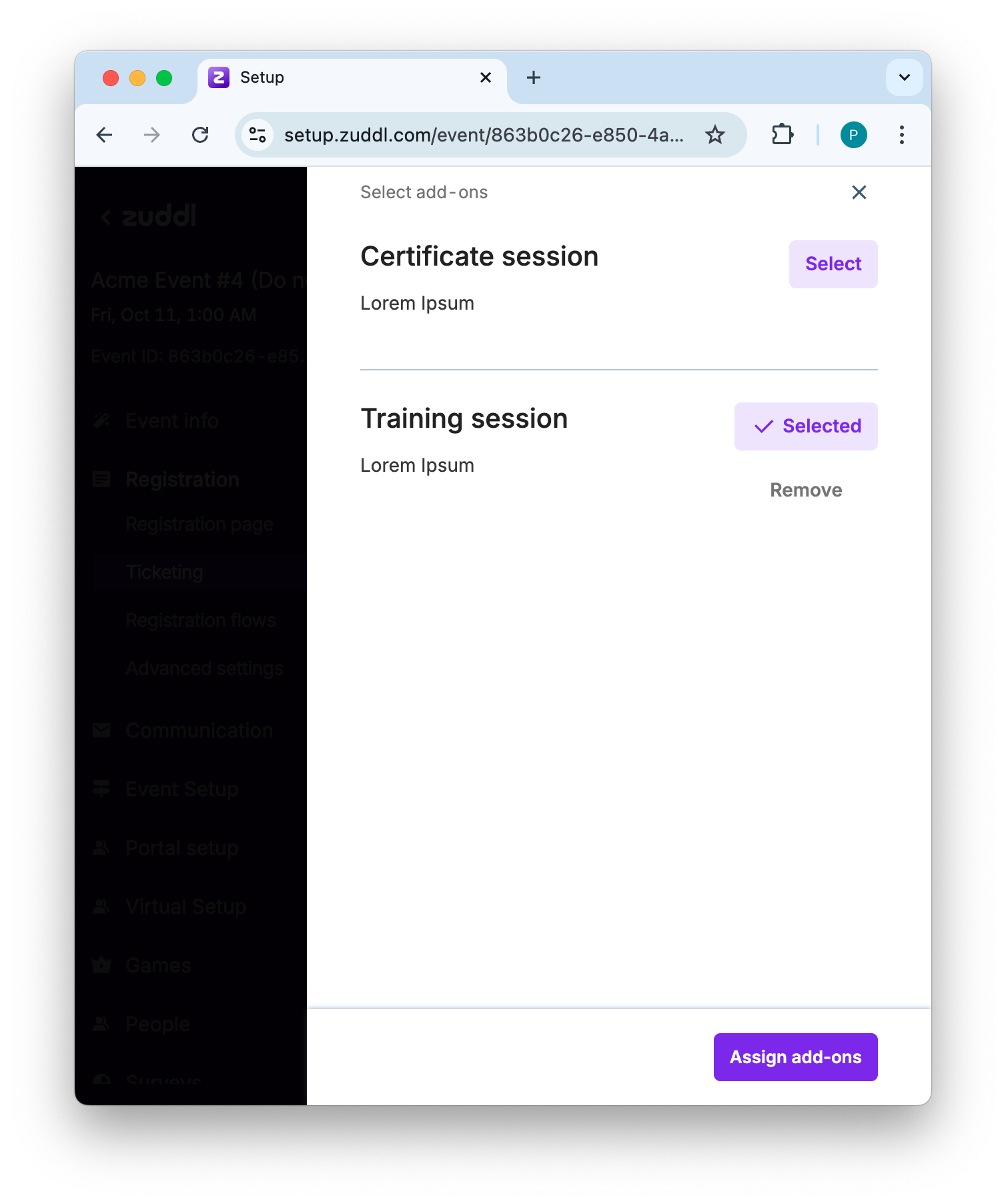 Select the sessions within the add-on and click Select sessions. On the add-ons page, click Assign add-ons. This adds the selected add-ons with the selected sessions.