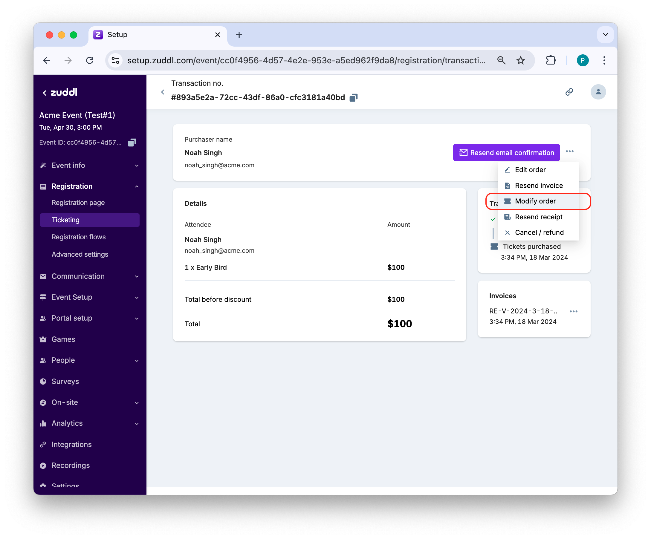 On the transaction details page, click the three-dot option and click Modify order. On the modify screen, you can view each ticket and take action based on the ticket.