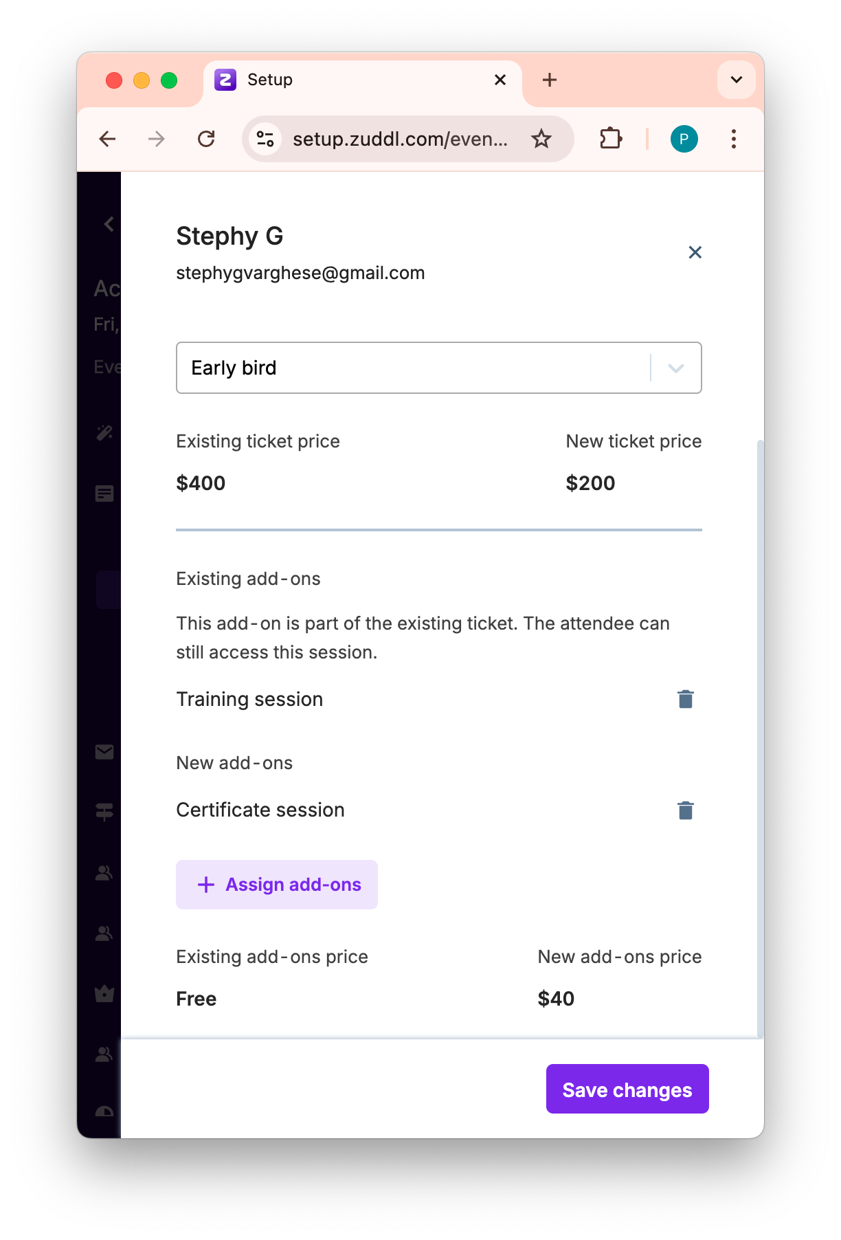 You can view the modification history, click the View modification history button. You can view the modification date, ticket and add-on details for each attendee. The older ticket details are shown under Previous ticket and modified ticket is shown under Updated ticket. Changes made to the add-ons are shown under the Updated add-ons section.