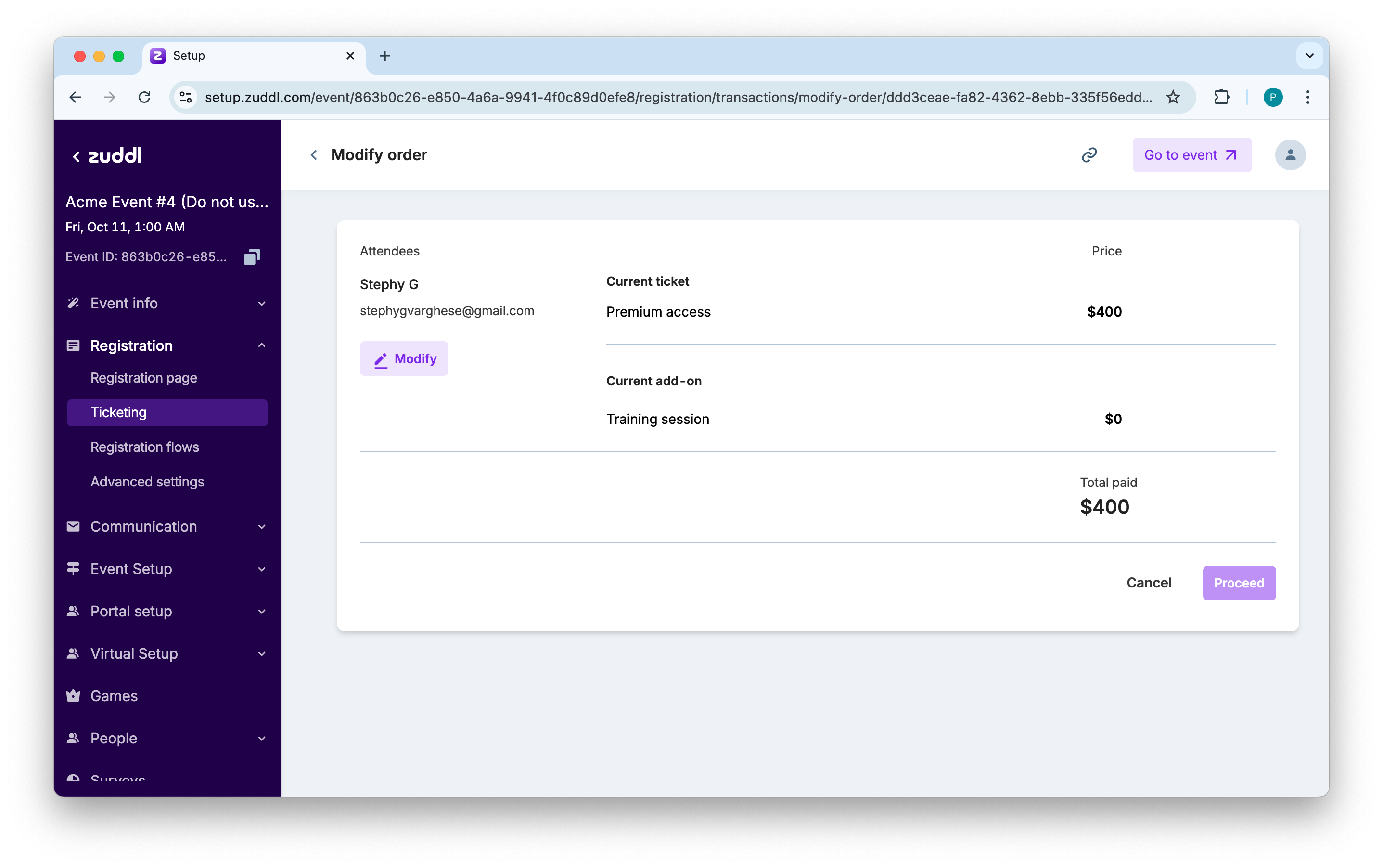 On the modify screen, click the Modify button for the required ticket/attendee.