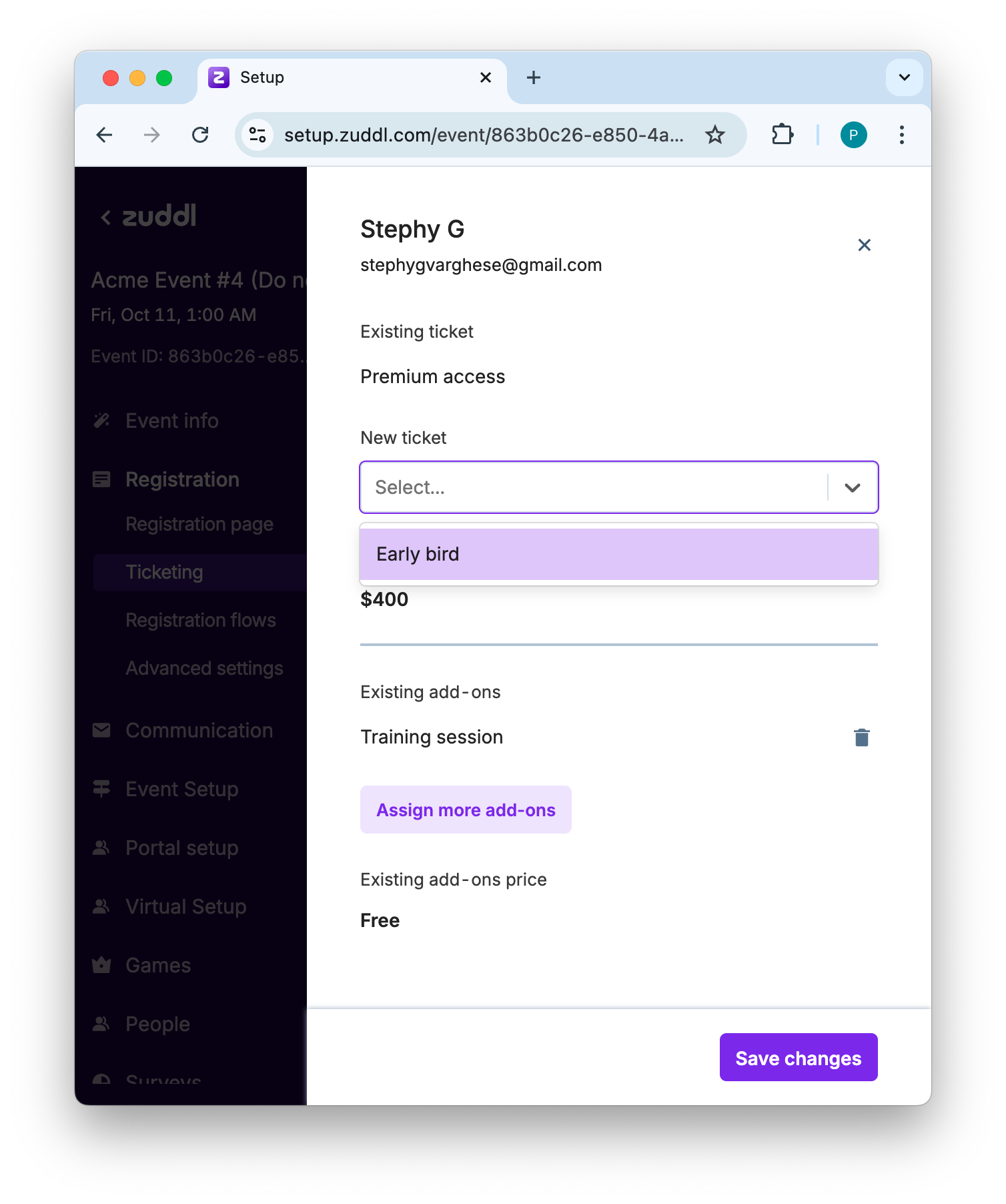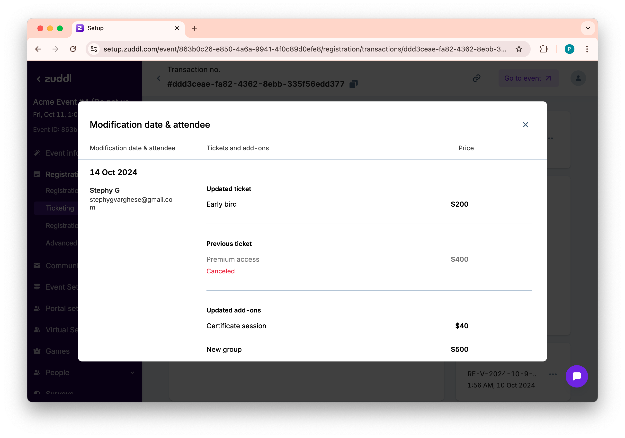 You can view the modification history, click the View modification history button. You can view the modification date, ticket and add-on details for each attendee. The older ticket details are shown under Previous ticket and modified ticket is shown under Updated ticket. Changes made to the add-ons are shown under the Updated add-ons section.