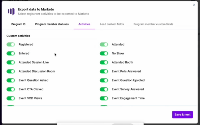 When you create a new using the base program, the assets of the base programs namely; smart campaigns, form, smart lists, and landing page are copied over such that all campaign members details are passed over to the new program.Under the Custom Activities tab, toggle all the attendee activities you wish to receive in your Marketo Program.