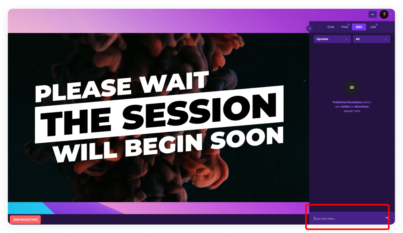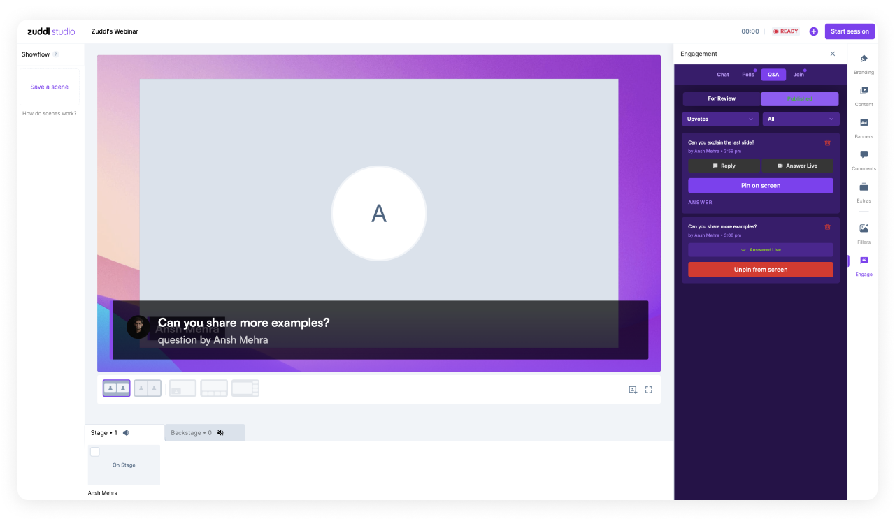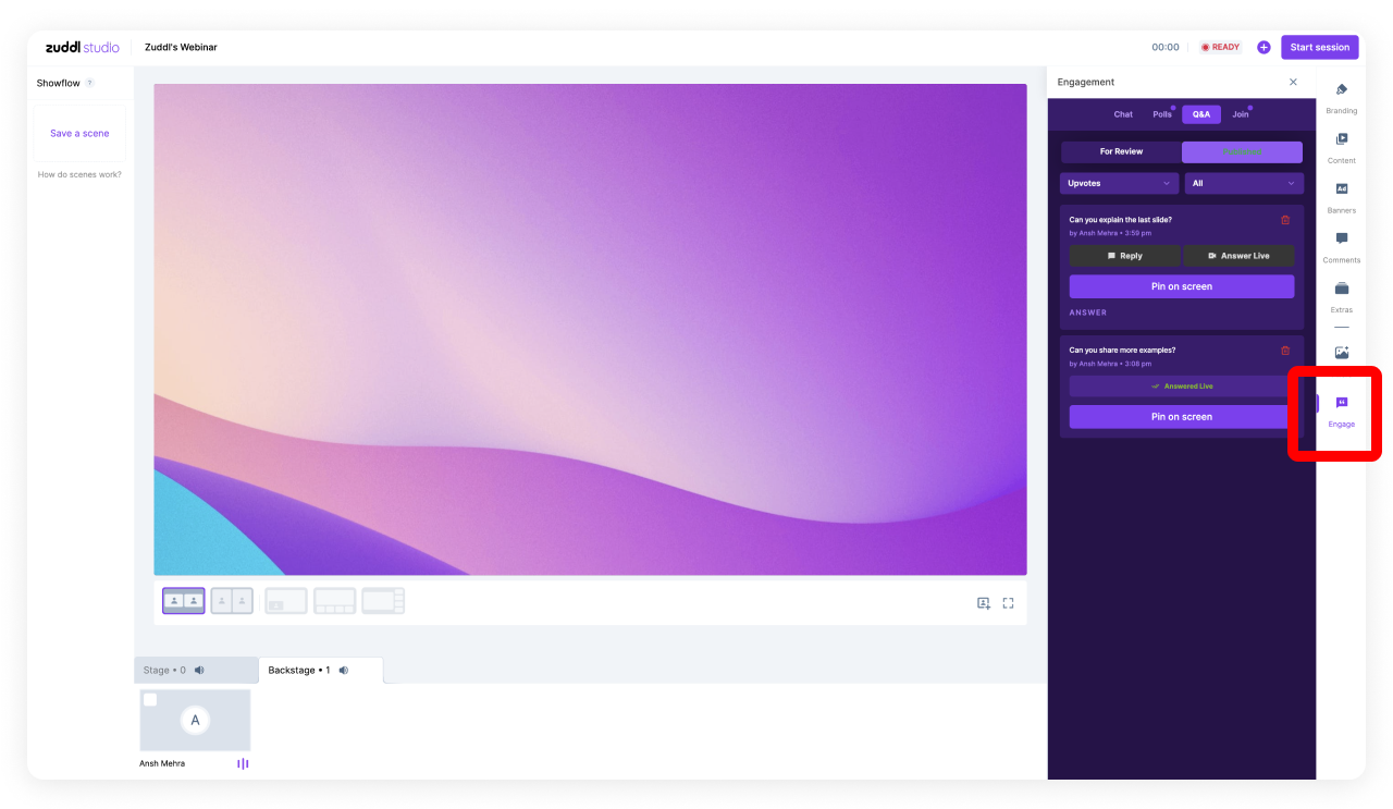 You will be managing all questions backstage. Once you refresh, you'll again get the pop-up that asks you to enter Backstage. Once you do that, after your video and audio check, you'll re-enter your Studio. On the right, click on Engage: