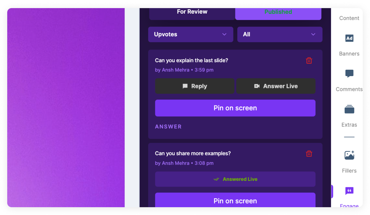 If you check 'Moderate Q&A,' all questions will need your review before going live. As an Organiser, when you enter the event, you will see all asked questions under 'For Review.'