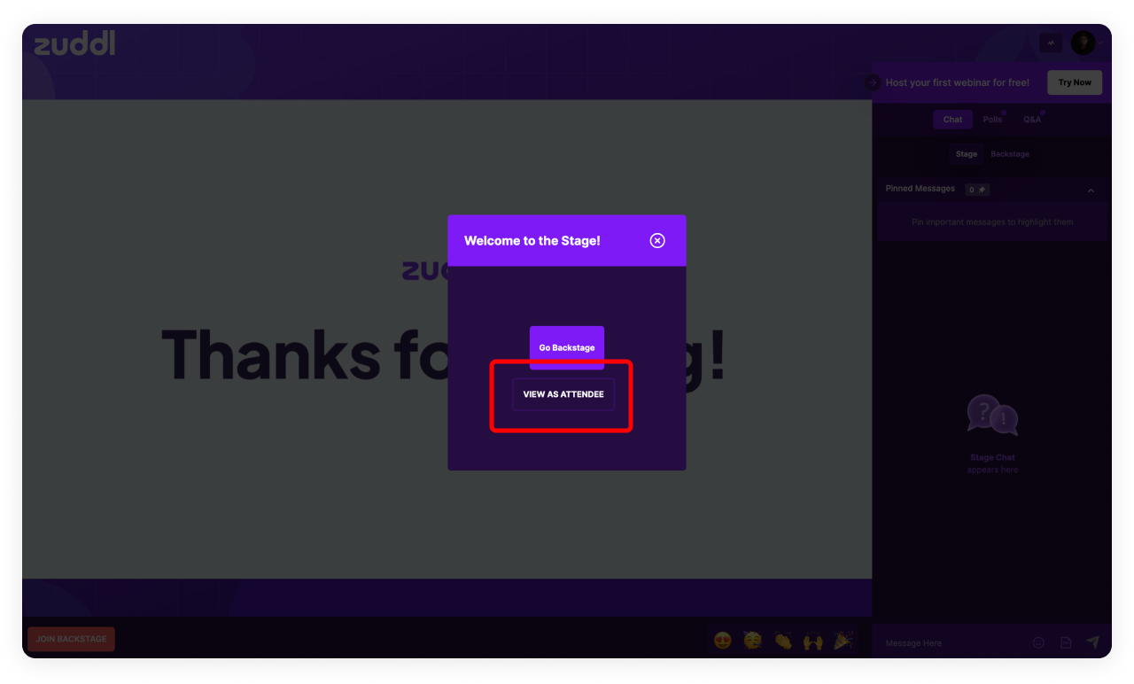 Click on 'Go to Webinar' in the top right corner. You'll enter your webinar and see a pop-up. Click on 'View as Attendee'.