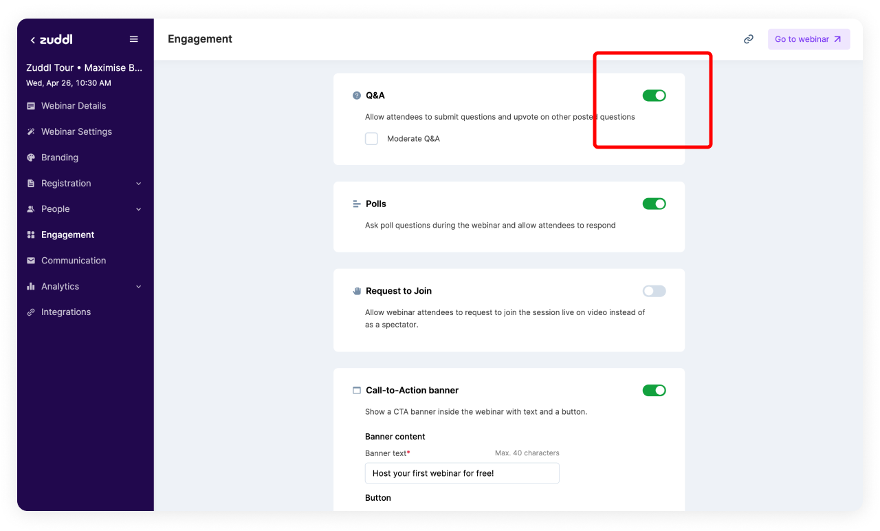 Go to Engagement > Enable Q&A. Click on the toggle.