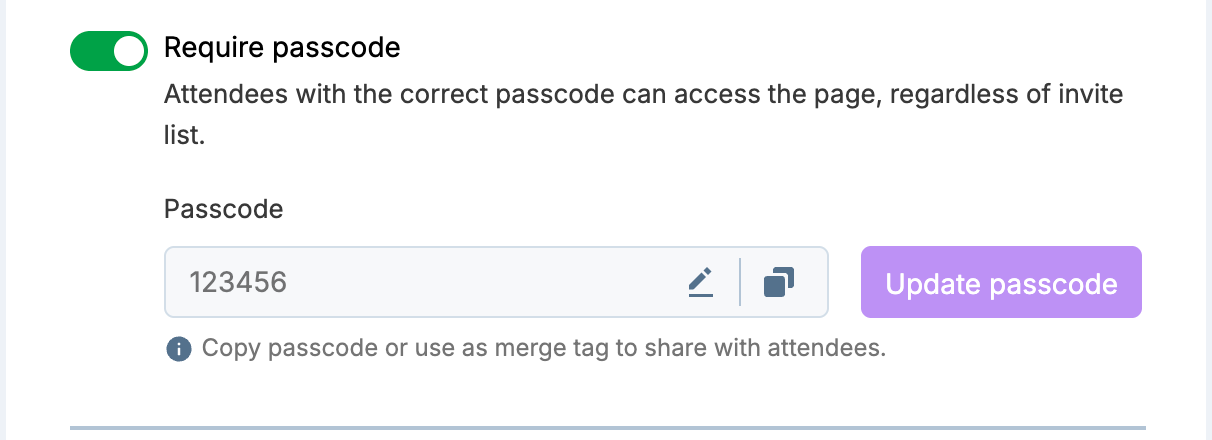Click Update passcode and click the copy button to copy or share it with your attendees over email communication using merge tags. Learn how to use merge tags.