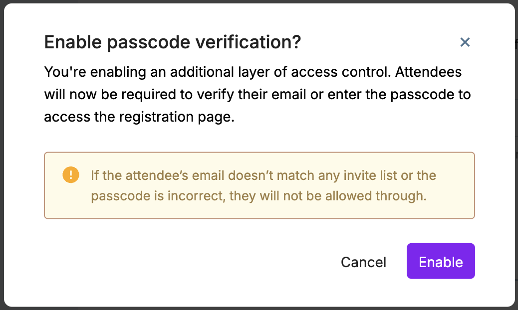 Alternatively, you can allow attendees to enter a passcode to access the webpage. To do so, toggle on Require passcode and click Enable on the confirmation pop-up.