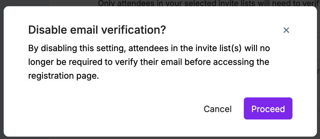 When disabled, the registration page becomes publicly accessible. To disable, toggle off Verify email and click Proceed on the confirmation pop-up.