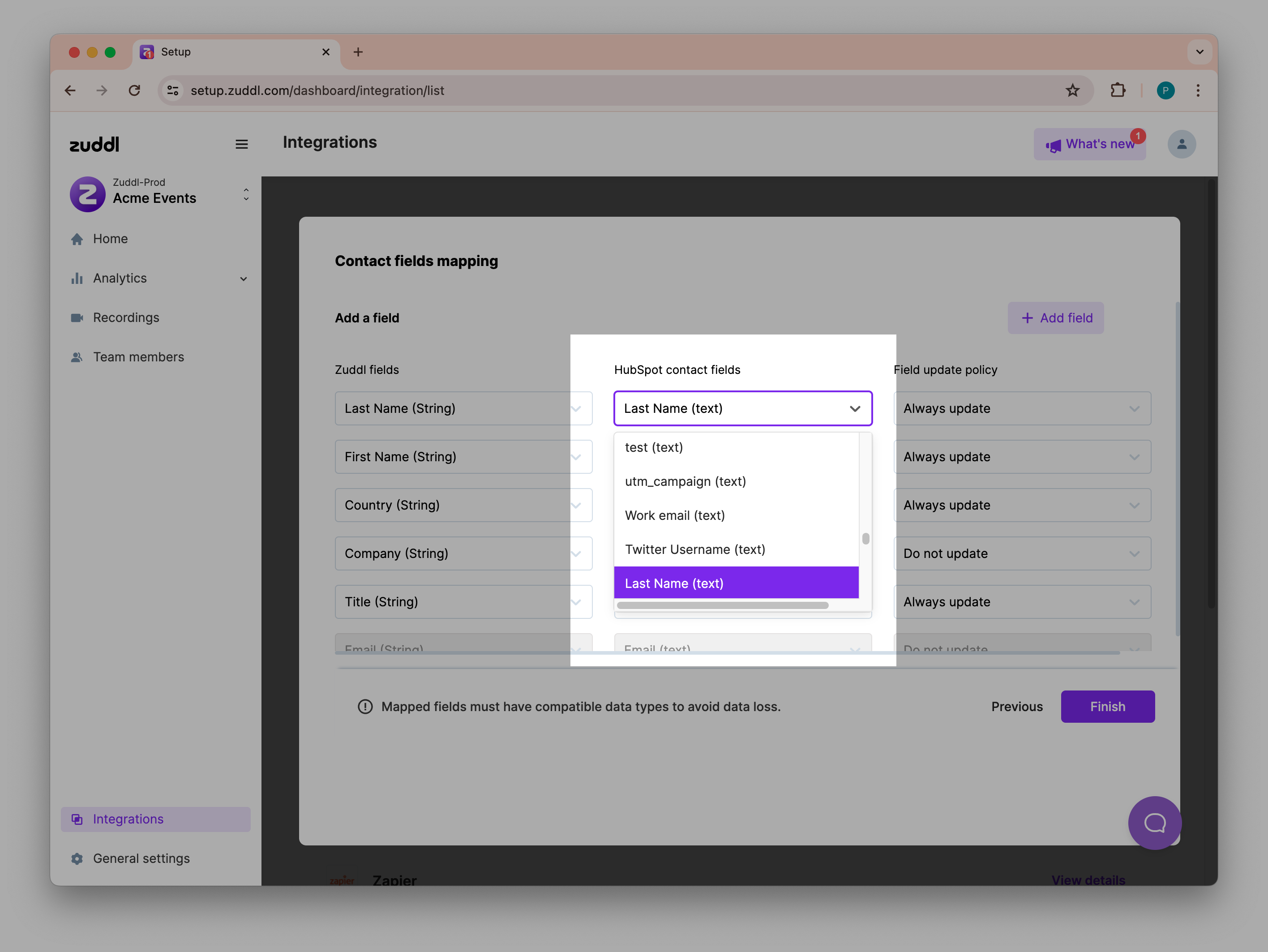 Do not update if source is empty: If the Zuddl field value is empty, this option does not pass the value of the Zuddl field to the mapped HubSpot field.