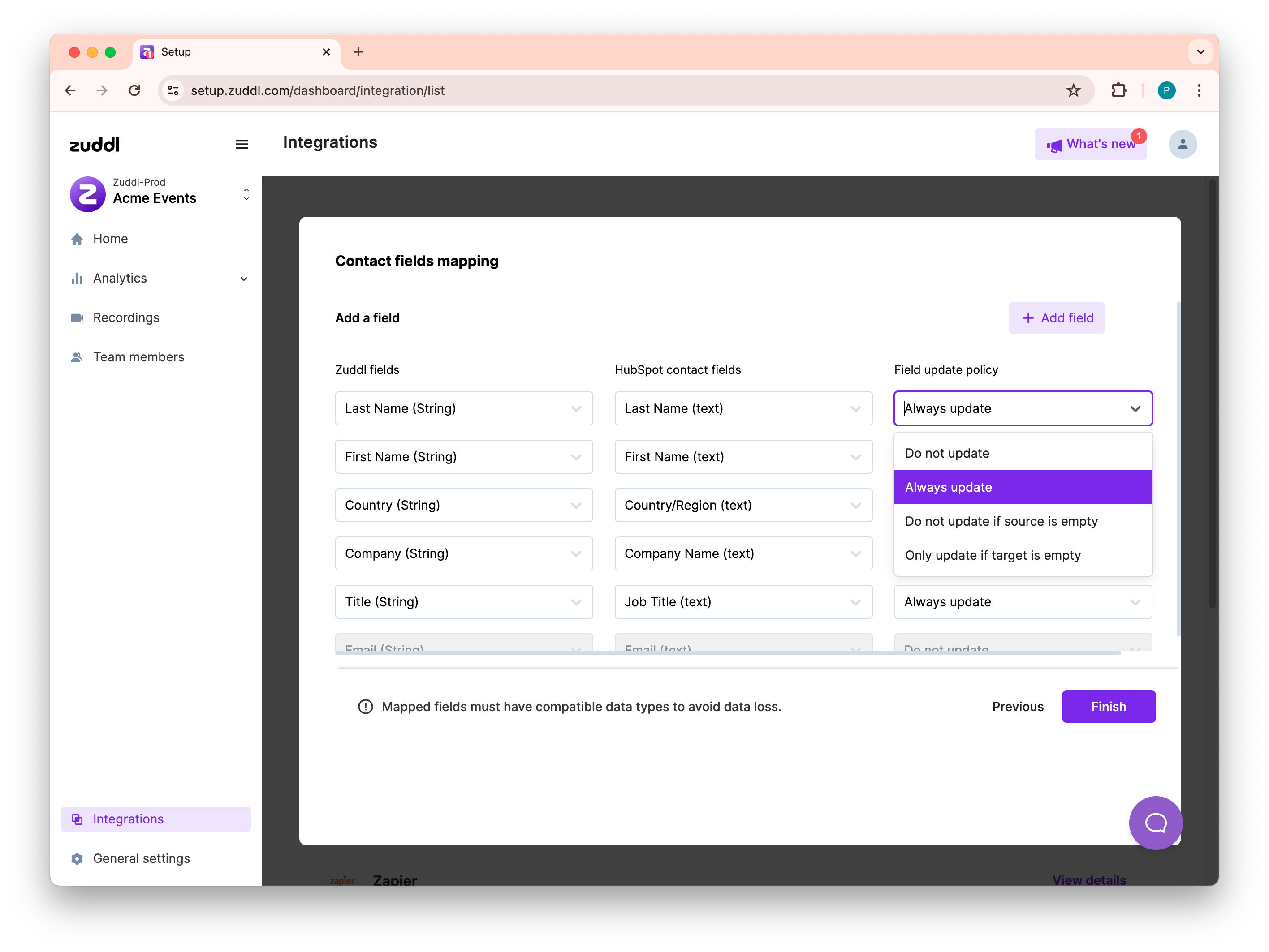 Always update: always passes the Zuddl field value to the mapped HubSpot field.