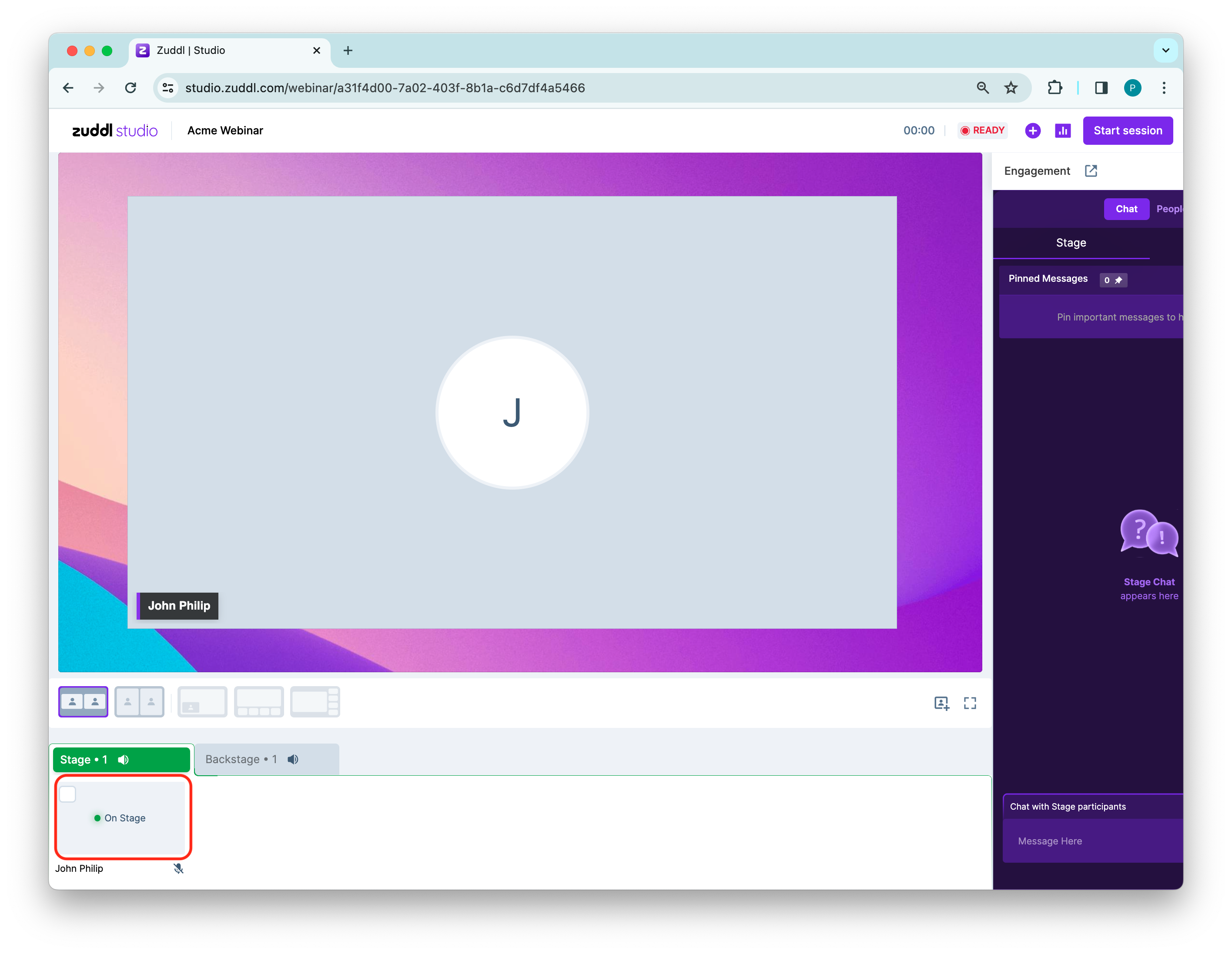 At the bottom of the page, you can find the Stage and Backstage tabs. All speakers currently on the stage are shown under the Stage tab, and the speakers on backstage are under the Backstage tab (with indicators to show how many speakers are in each section).