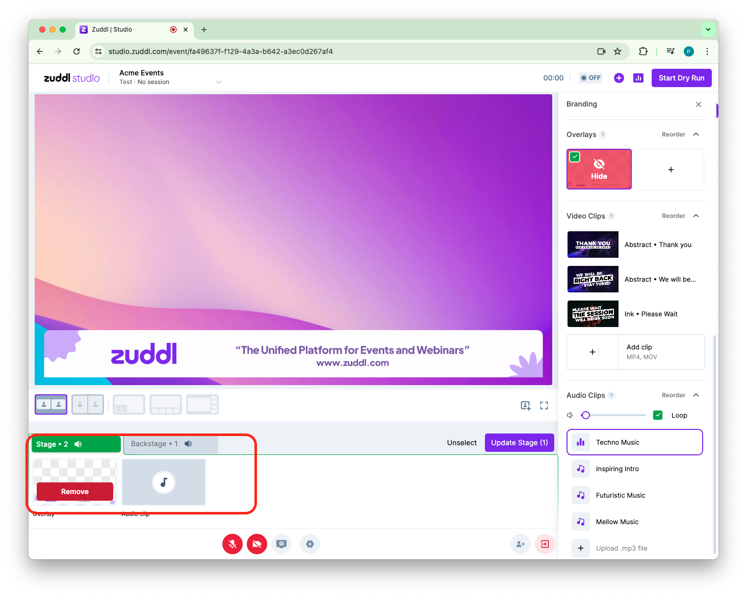 It is highly recommended to set up your studio backstage with all the required elements before the event to easily add elements at the time of the event.