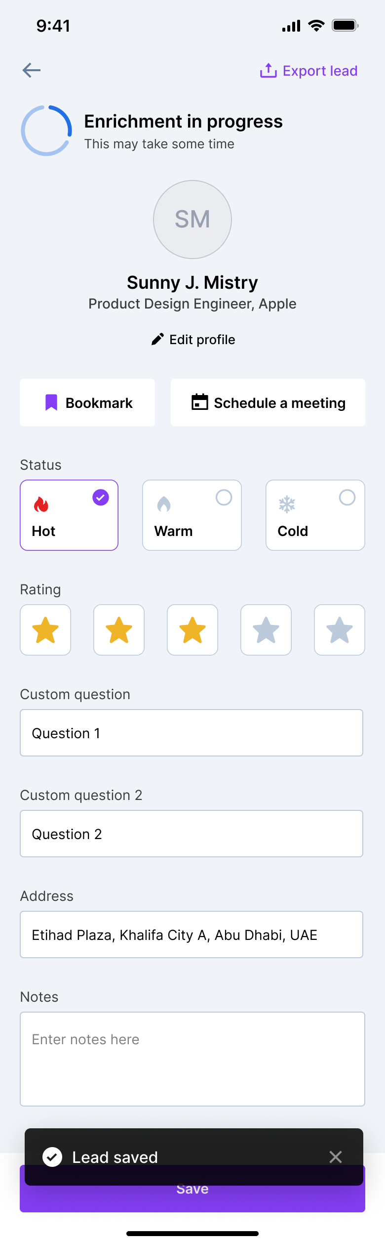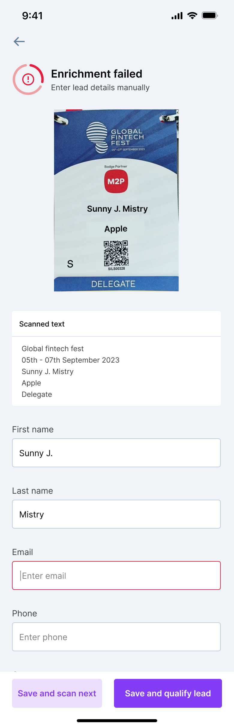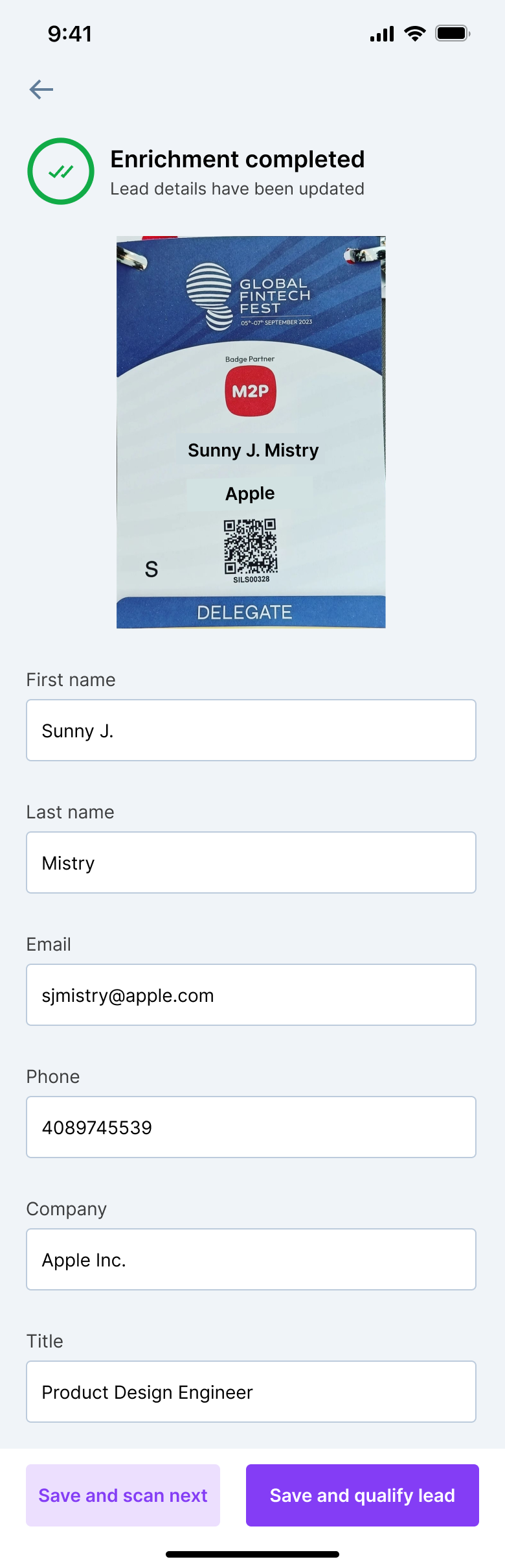 Next on the lead details page, the app captures the text from the badges and presents it as a text in the Scanned text text box. You can use utilize this to add details manually if required. The app maps the captured text to corresponding fields on the lead details page, such as first name, last name, company etc. The enrichment process utilizes the captured details to enrich the email id of the lead.