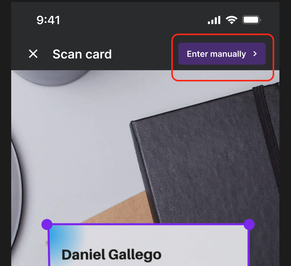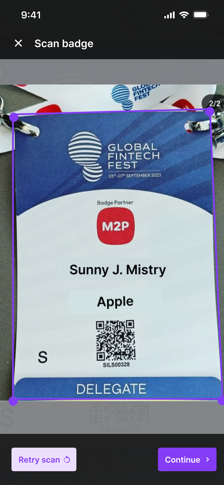 Once you've scanned the badge/card and are satisfied with the capture, click on the Continue button at the bottom. Zuddl app recognizes text strings on the badge and shows it to you on the edit details page under Scanned text textbox for adding details quickly and conveniently.