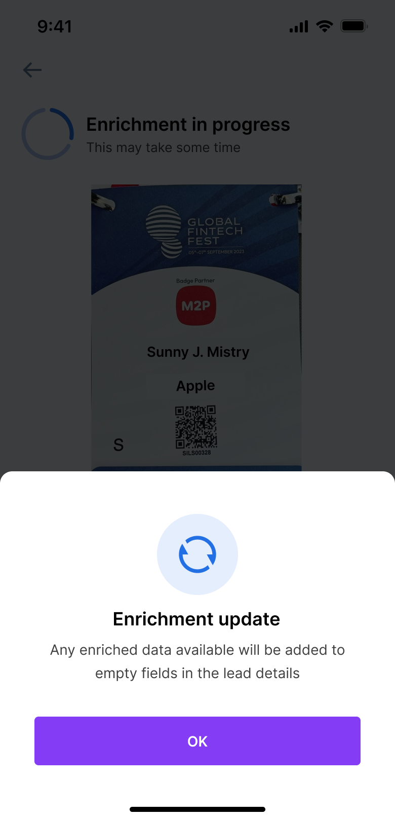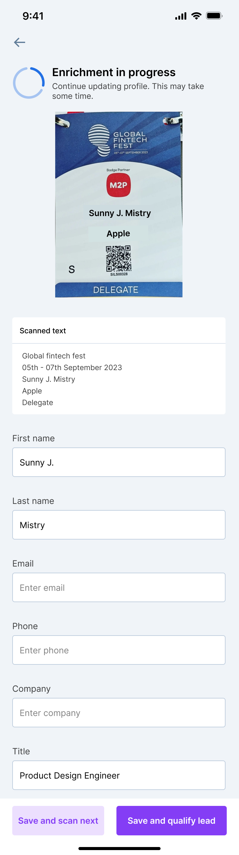 The enrichment process utilizes the captured details such as first name or last name on the badge and fetches missing details such as, email address and phone number. The enrichment process begins (Enrichment in-progress) right after the scan and is usually completed (Enrichment complete) in less than a minute. However, the time taken for the enrichment process to complete may vary for each lead profile.