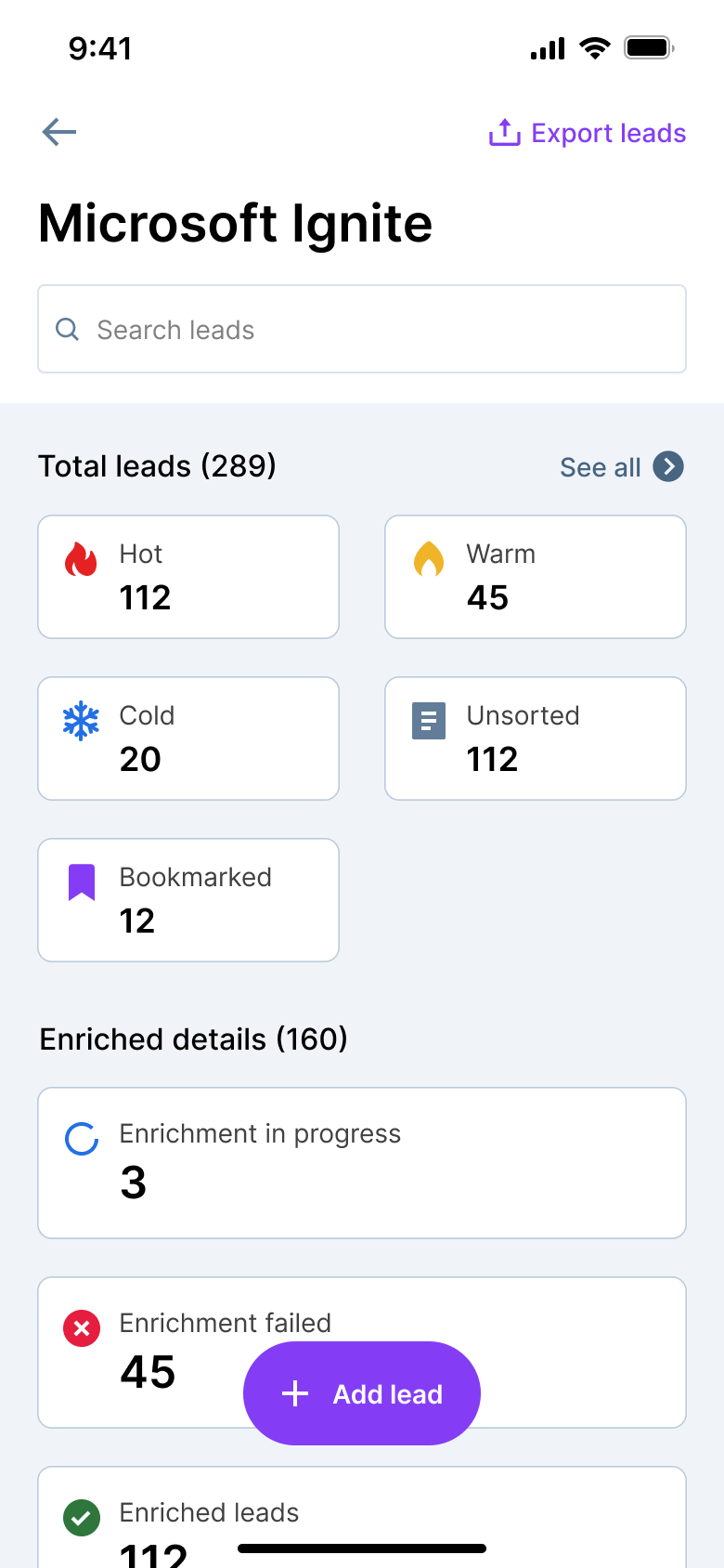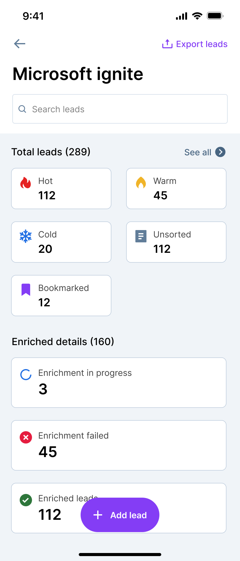 Enrichment In-progress, Enrichment failed, and Enriched leads are read-only card.